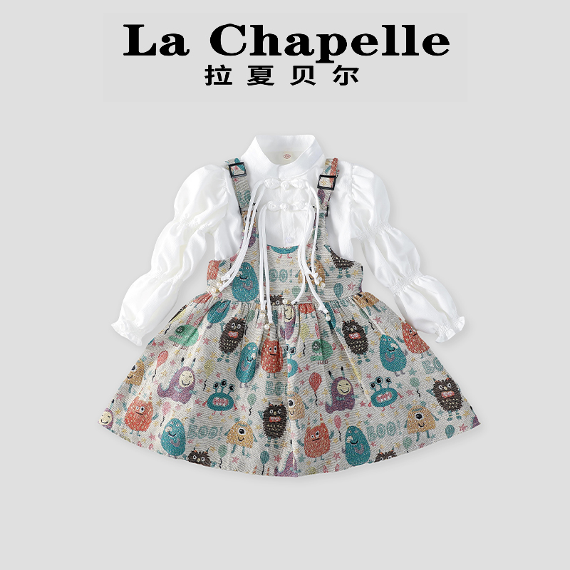 拉夏贝尔女童连衣裙套装2025春秋季新款儿童印花背带裙秋装两件套