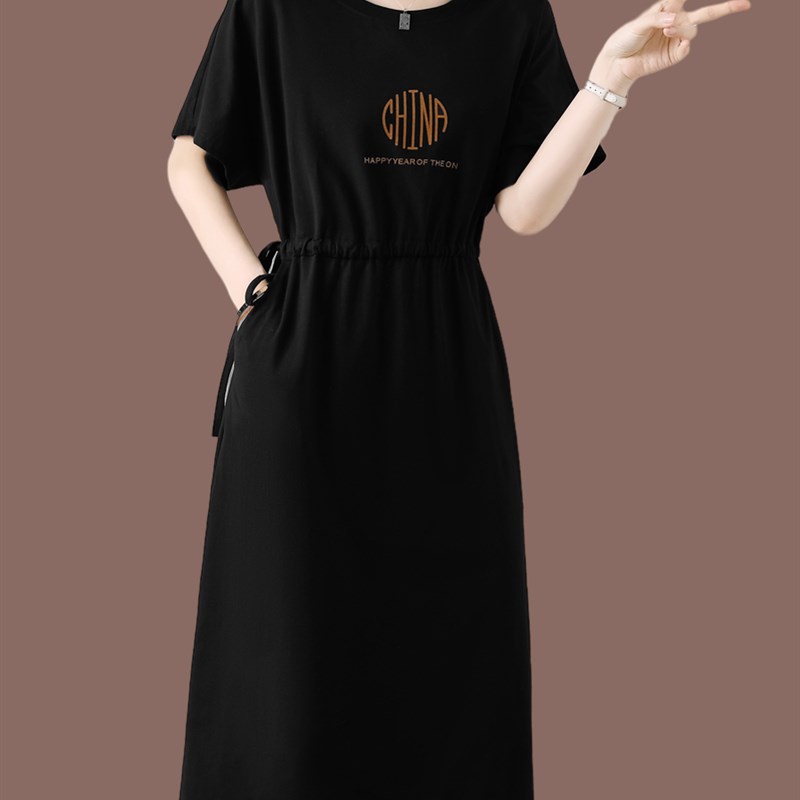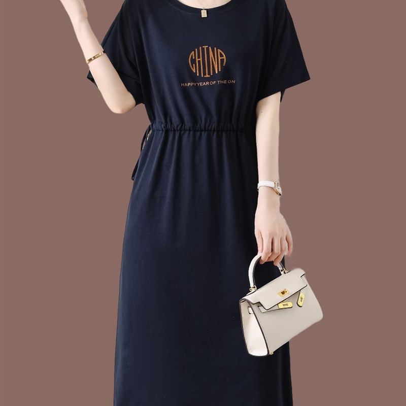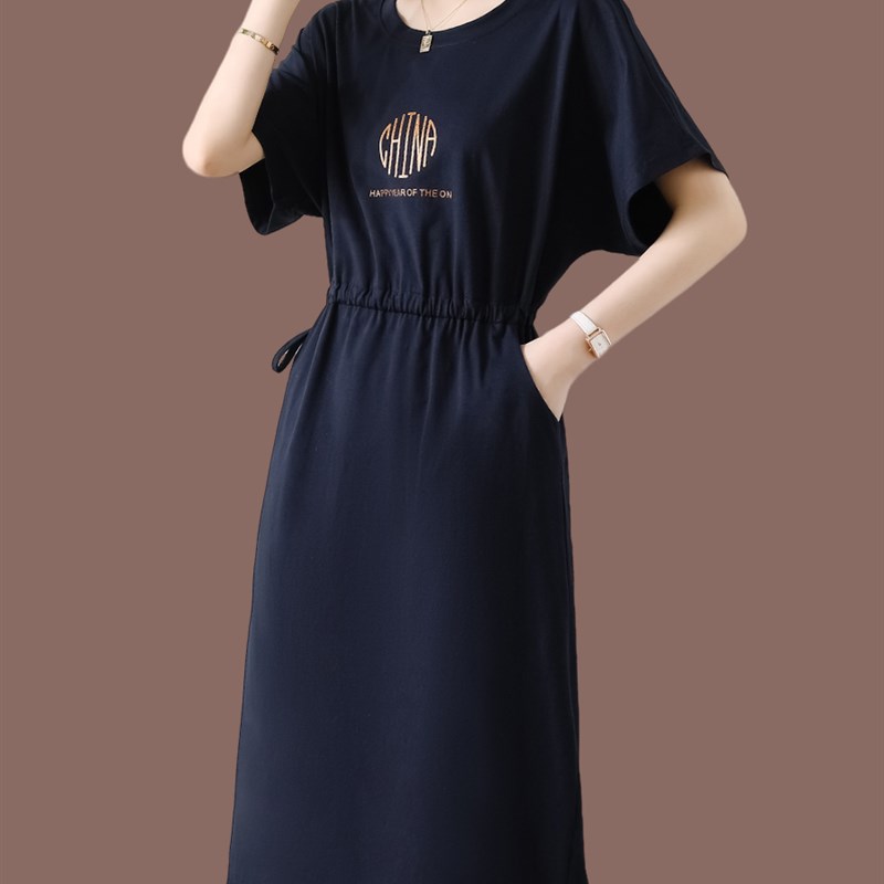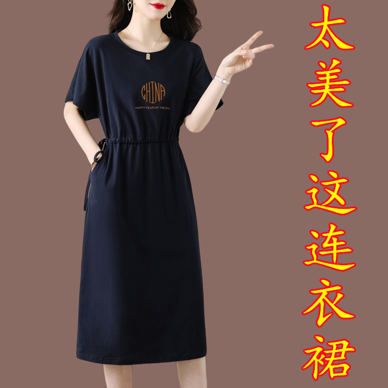 中年妈妈夏装纯棉连衣裙女宽松大码中长款夏季收腰显瘦针织裙子薄