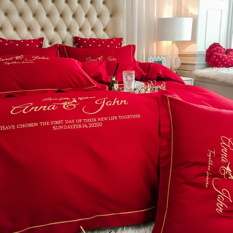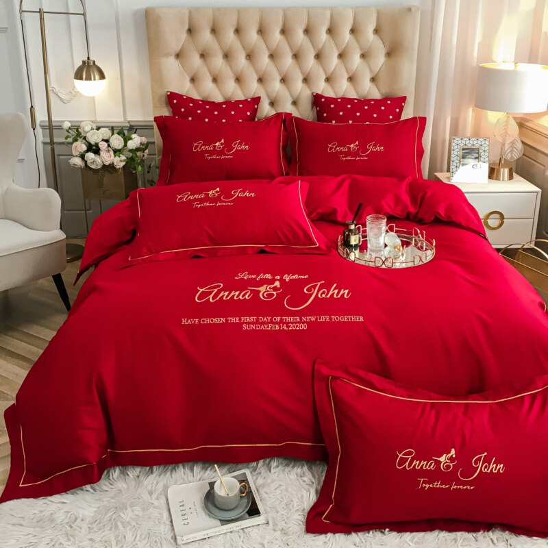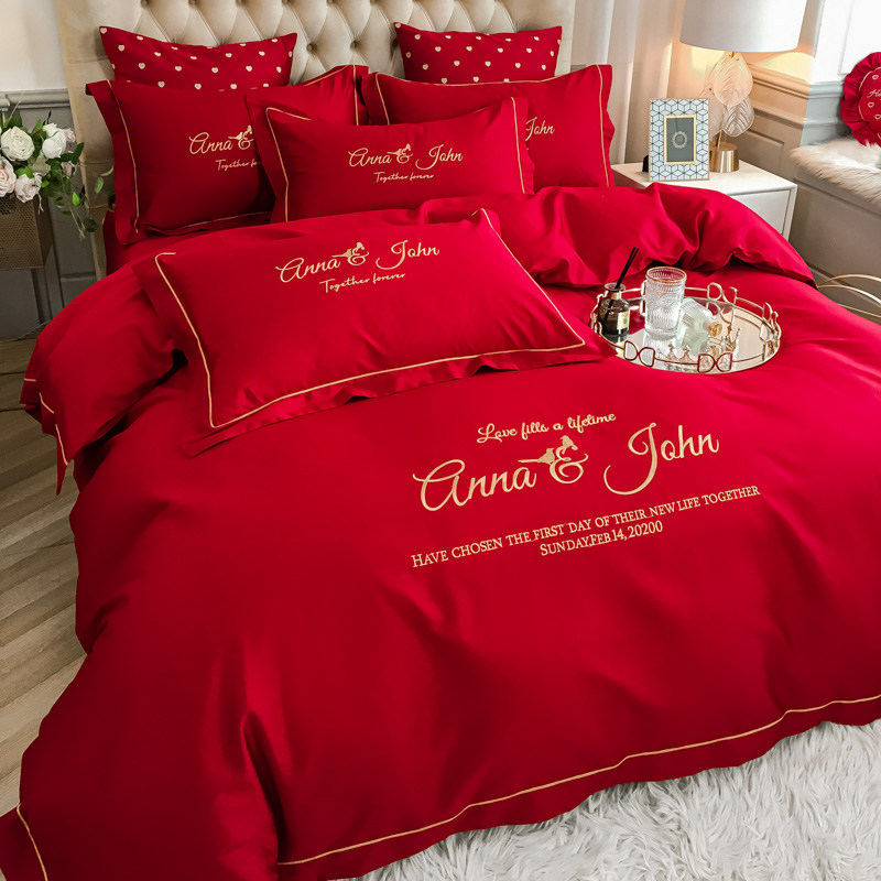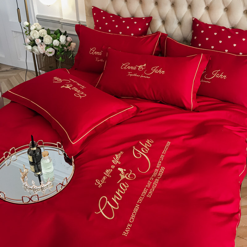 新中式婚庆床品60支长绒棉大红色双喜刺绣结婚被套床单四件套纯棉