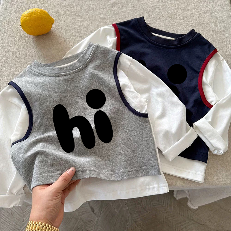 休闲打底衫纯棉透气薄款T恤男童女童假两件卡通趣味印花长袖T恤潮