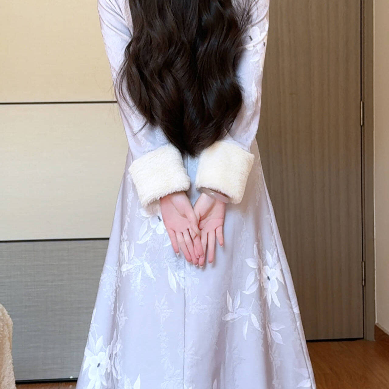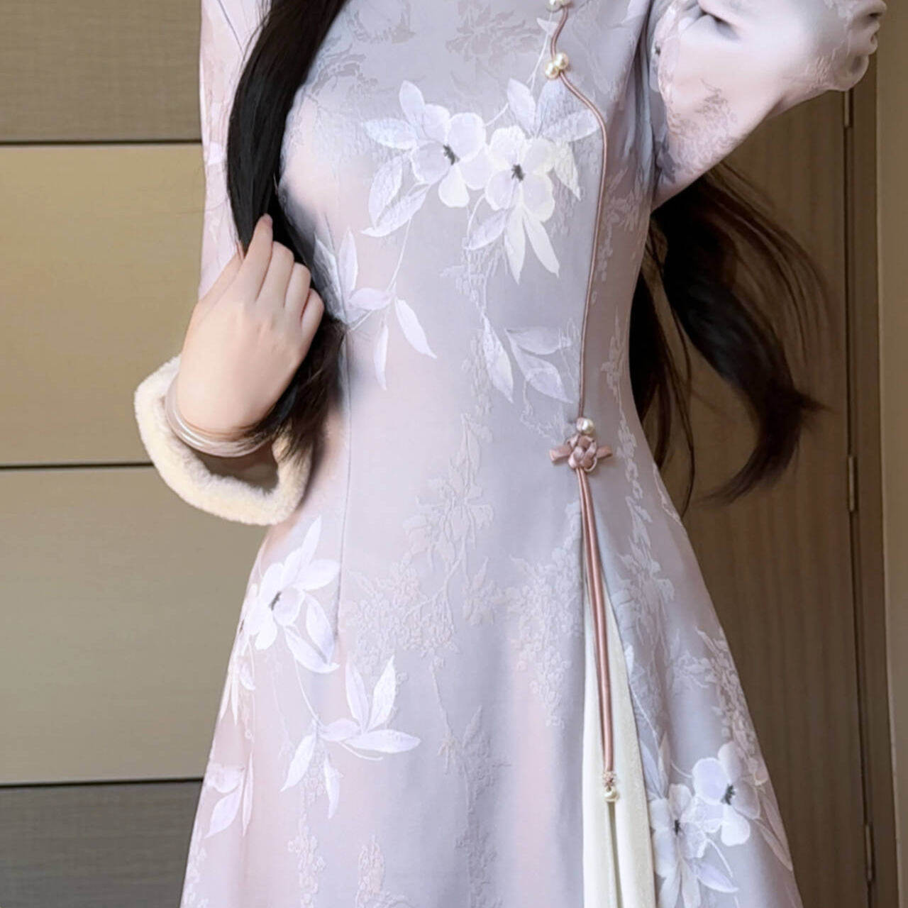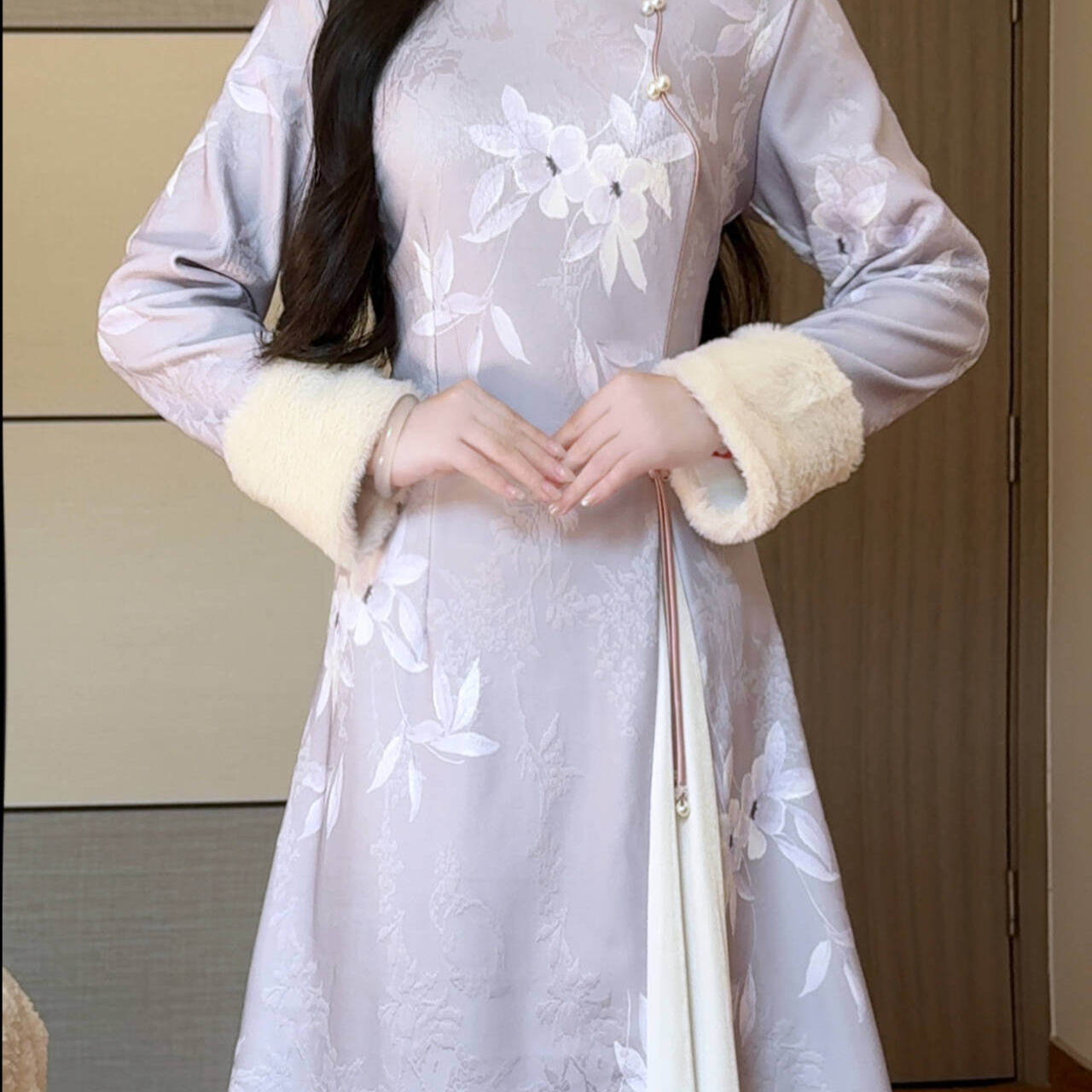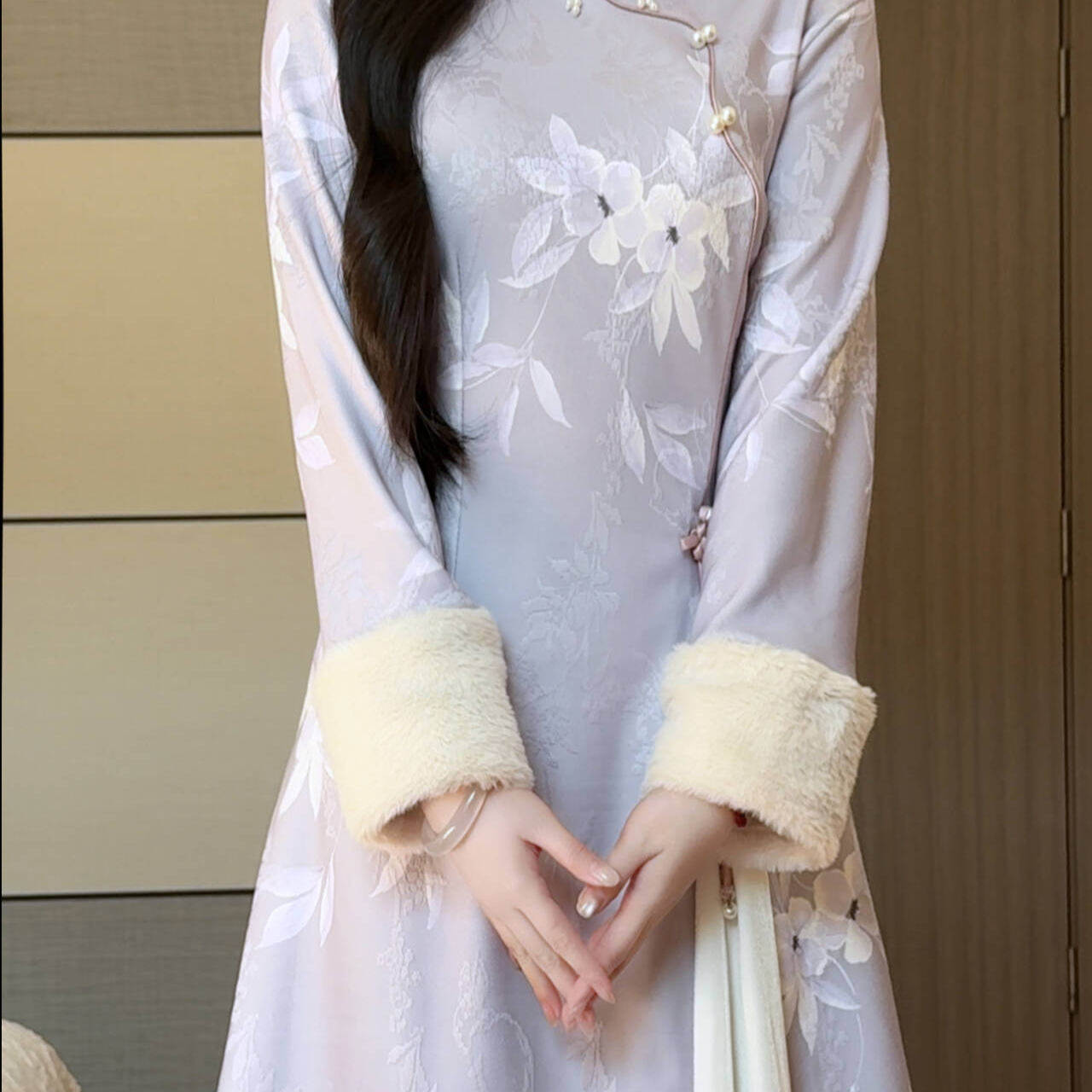 抹茶麻薯2025冬季新款紫色优雅毛绒领不开叉旗袍女保暖新中式长裙