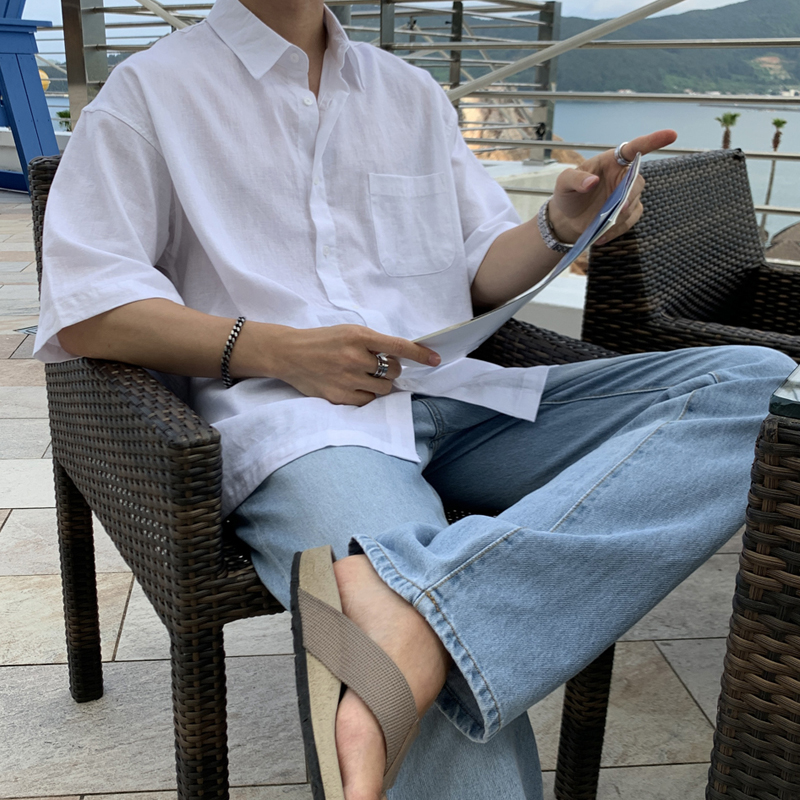 设计高级感棉麻短袖衬衫男士夏季款潮牌潮流痞帅宽松休闲衬衣外套