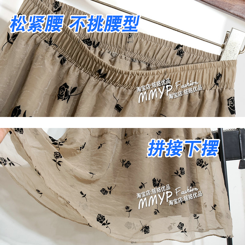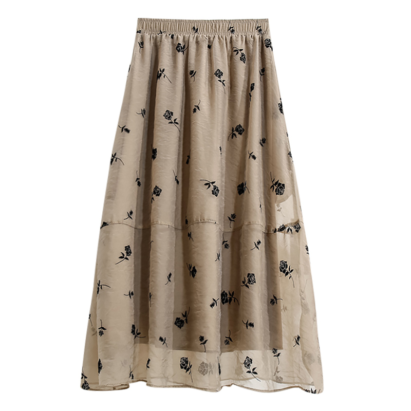 卡其色植绒花朵纱裙欧根纱半身裙女2025夏季小个子裙子长裙半裙