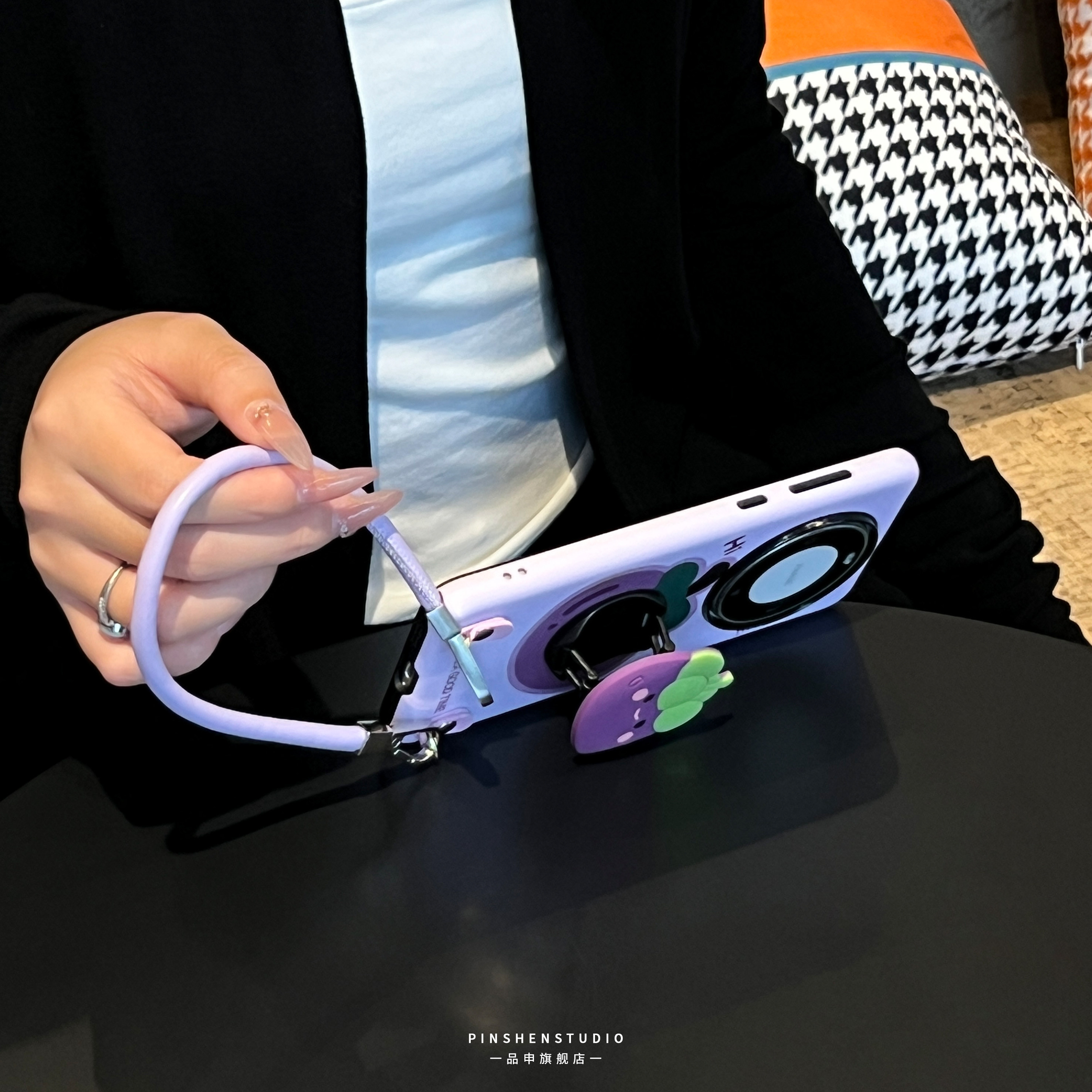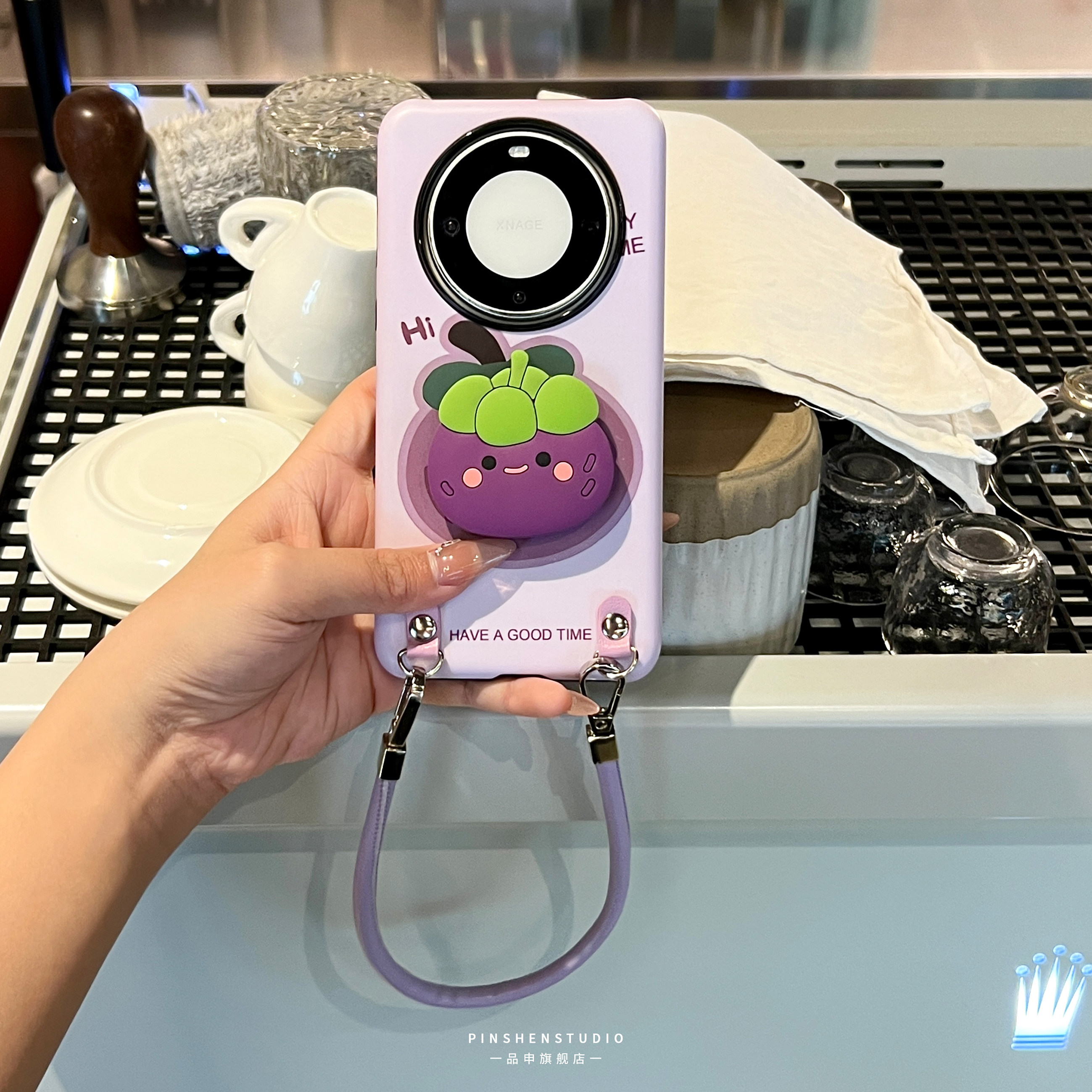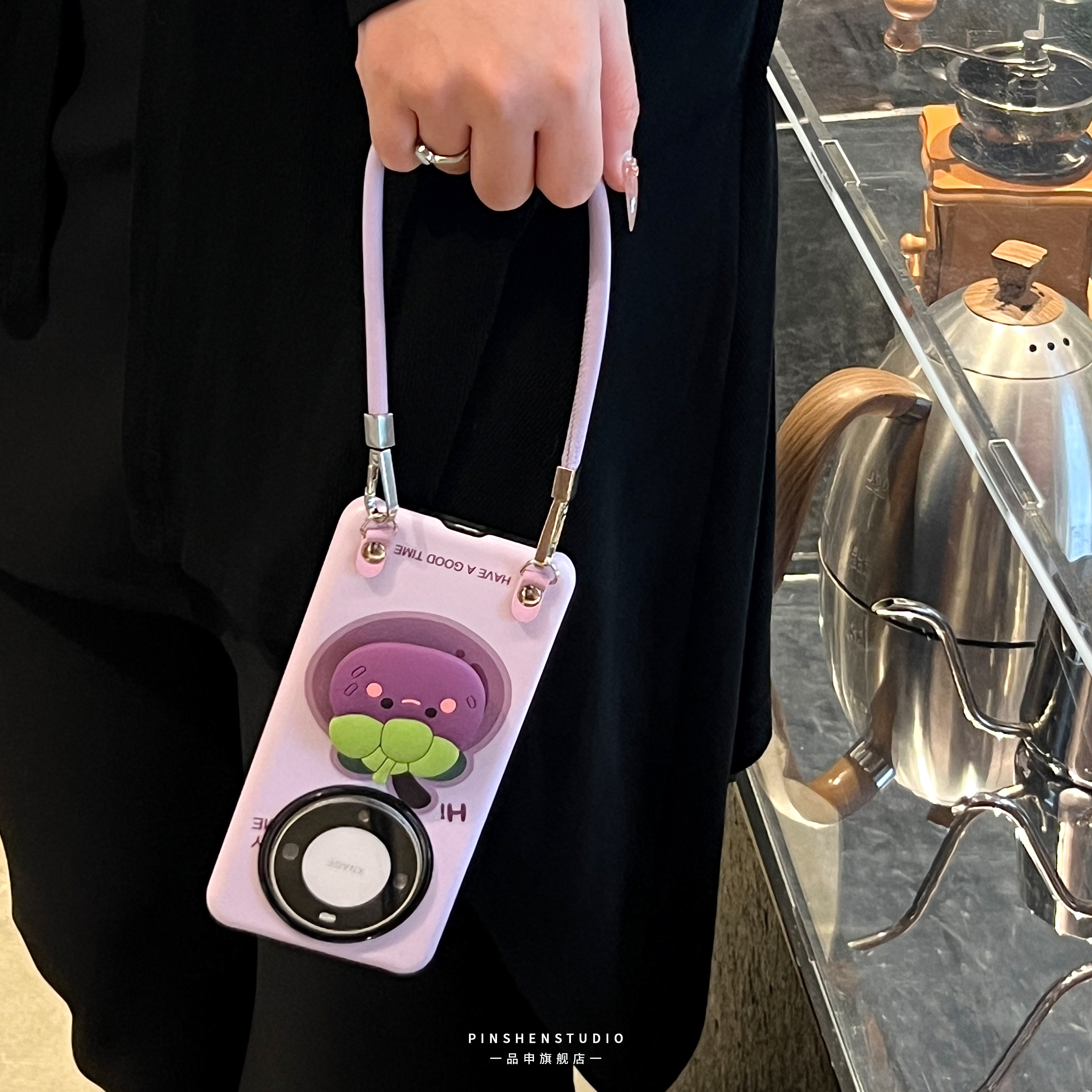 原创小众香芋紫卡通山竹支架手提斜挎皮绳适用华为mate80pro手机壳全包防摔高级感ins新款苹果17promax保护套