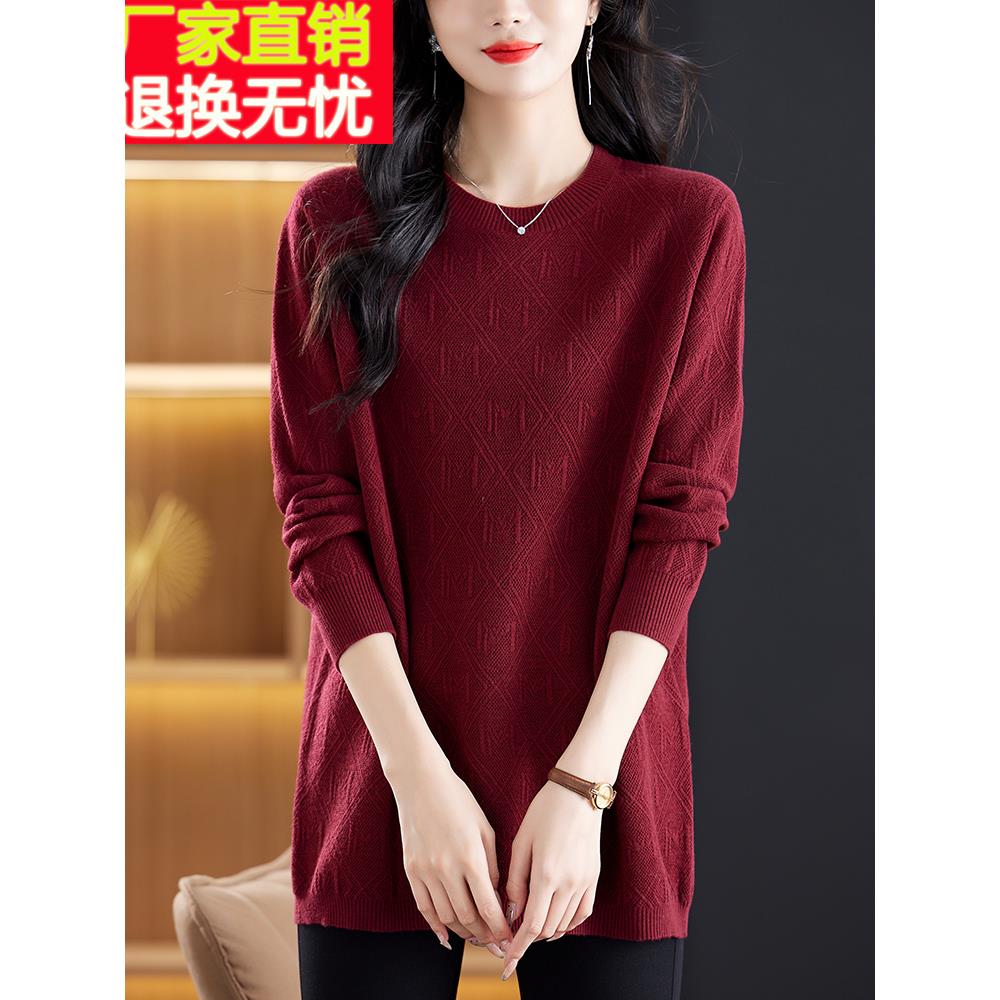 中年妈妈秋装圆领宽松毛衣女中长款洋气遮肚羊毛衫上衣大码打底衫