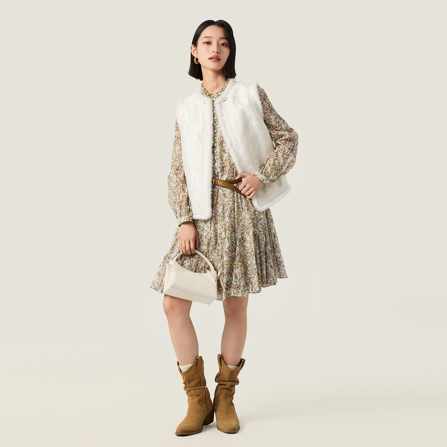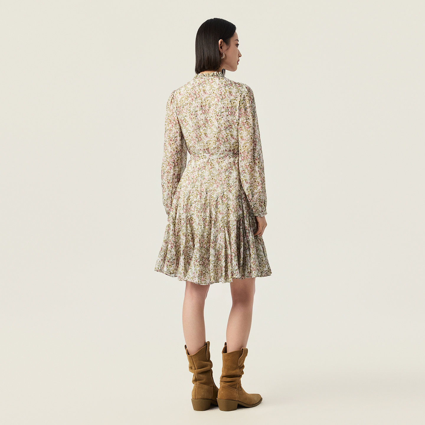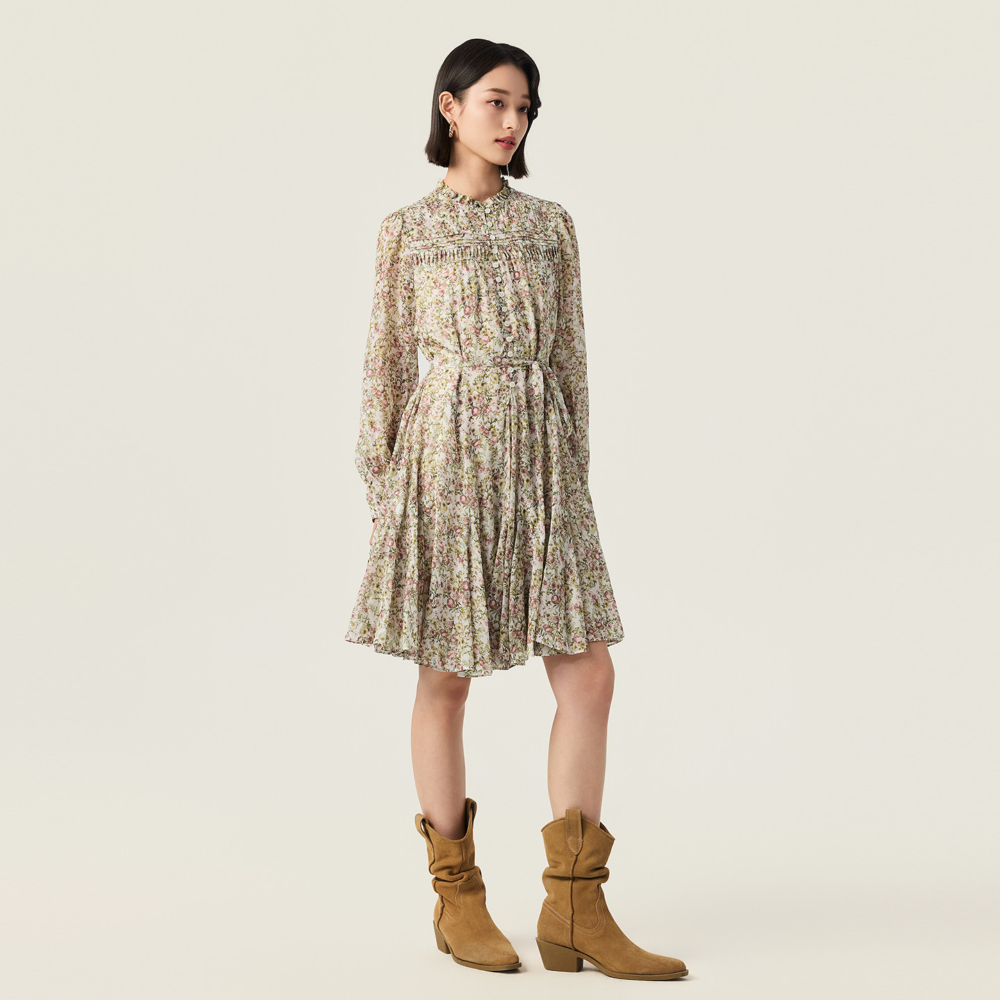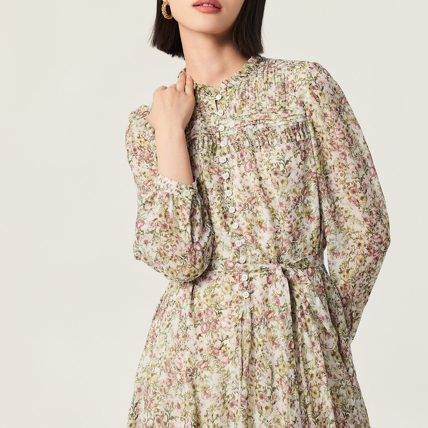 VGRASS26春季新款轻盈云感真丝雪纺印花收腰连衣裙