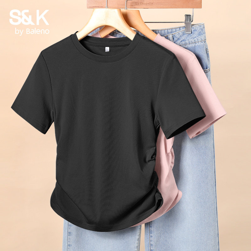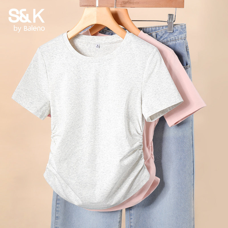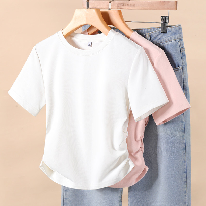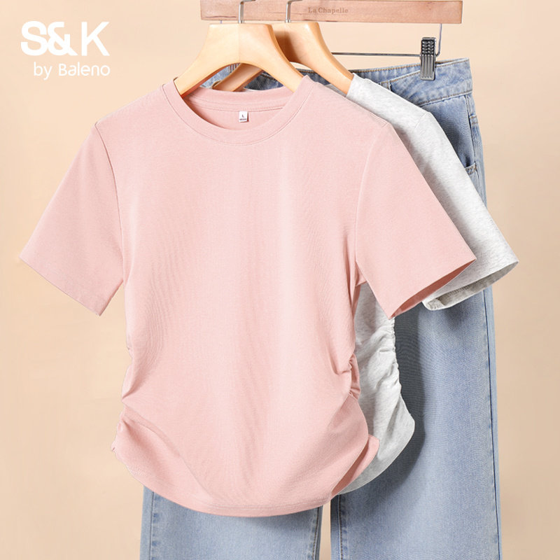 班尼路S&K系列修身短袖女夏季杏色短款t恤抽褶体恤圆领半袖上衣M