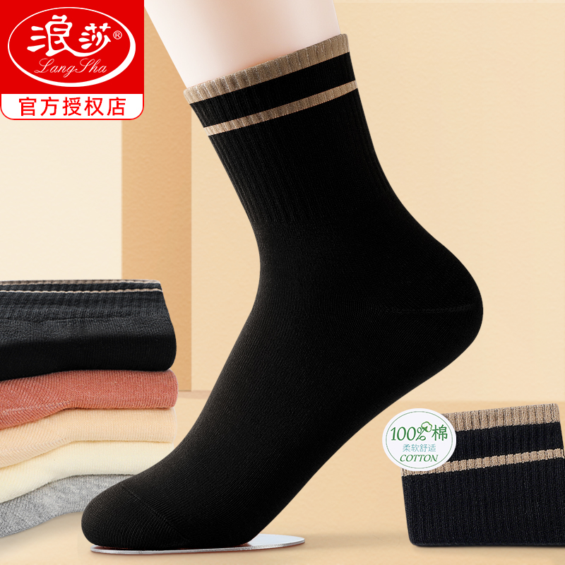浪莎黑色袜子女春秋款纯棉防臭2025年新款中筒秋季全棉袜长筒女袜