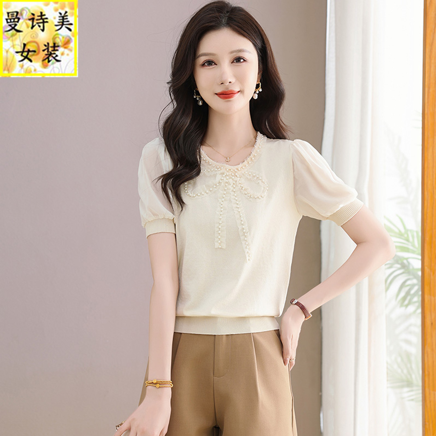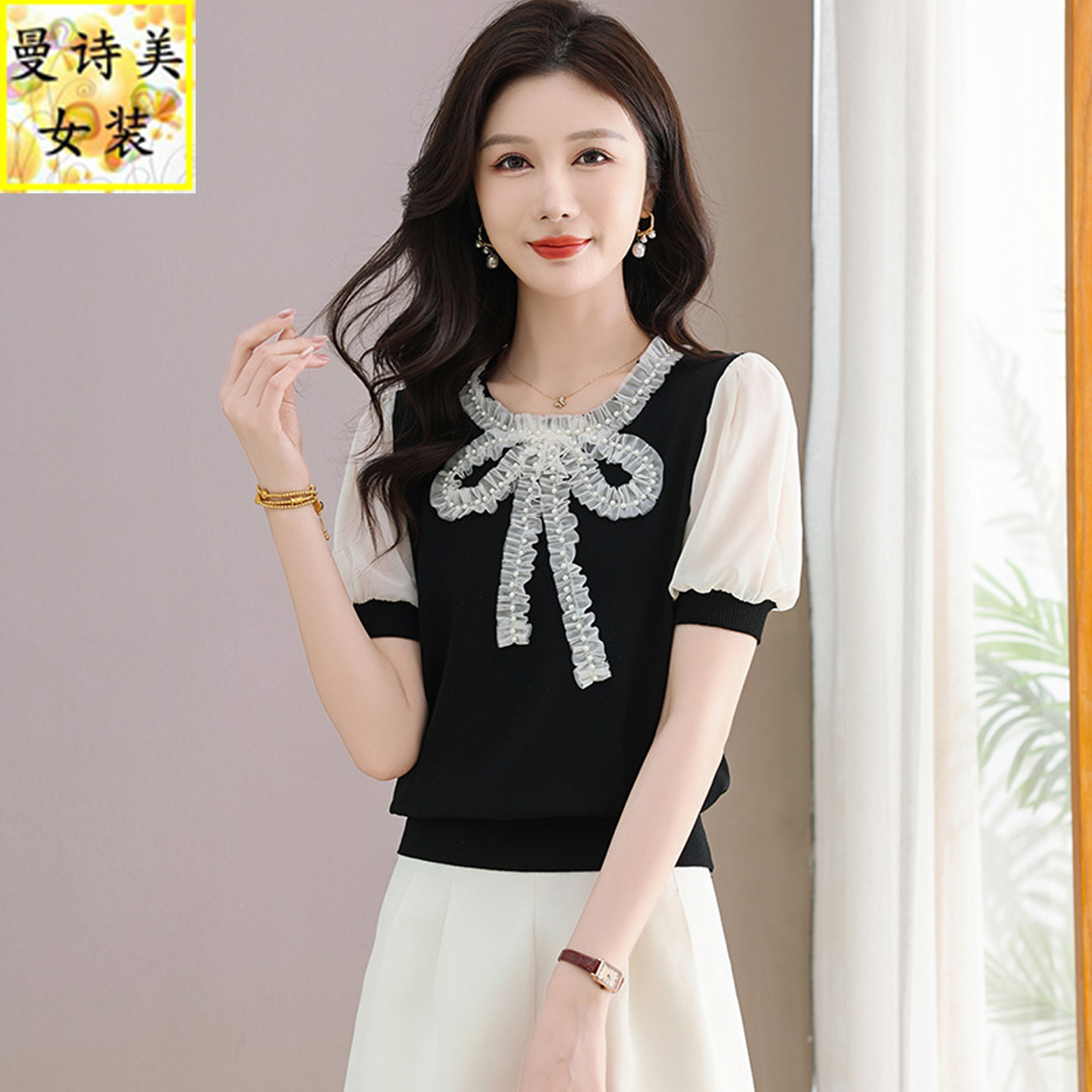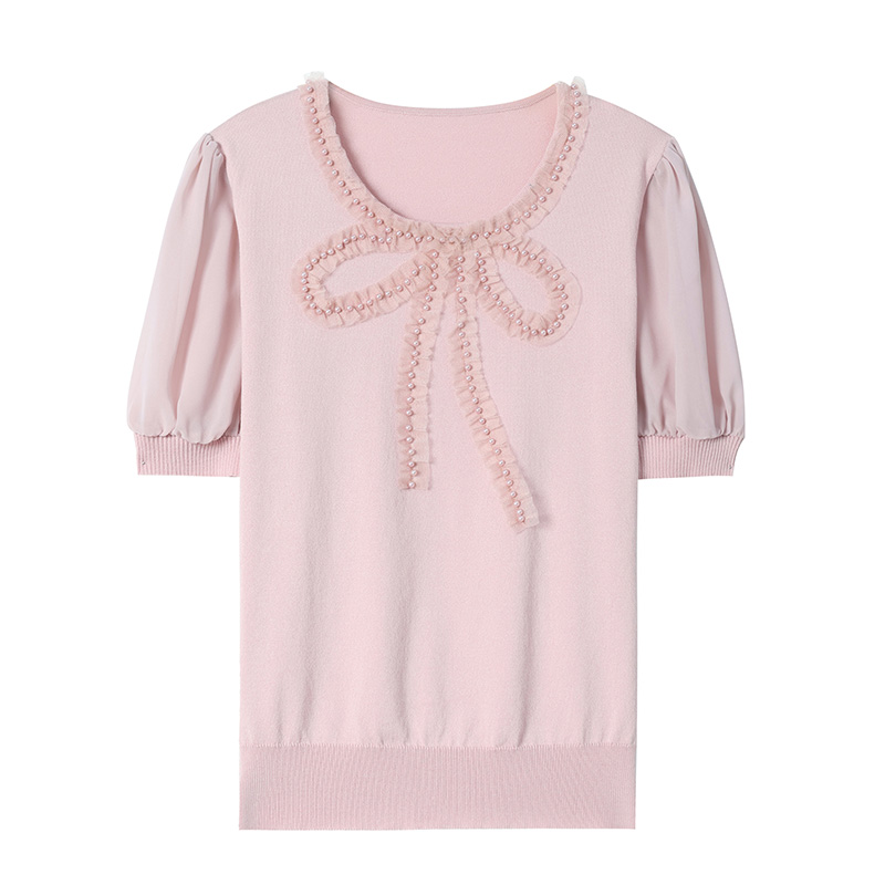 夏季冰丝短袖t恤衫女夏2025新款时尚洋气减龄蝴蝶结雪纺体恤上衣
