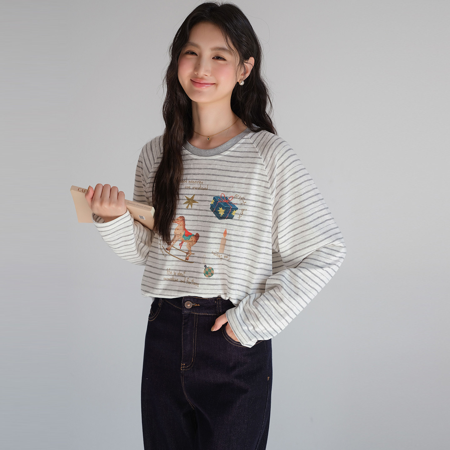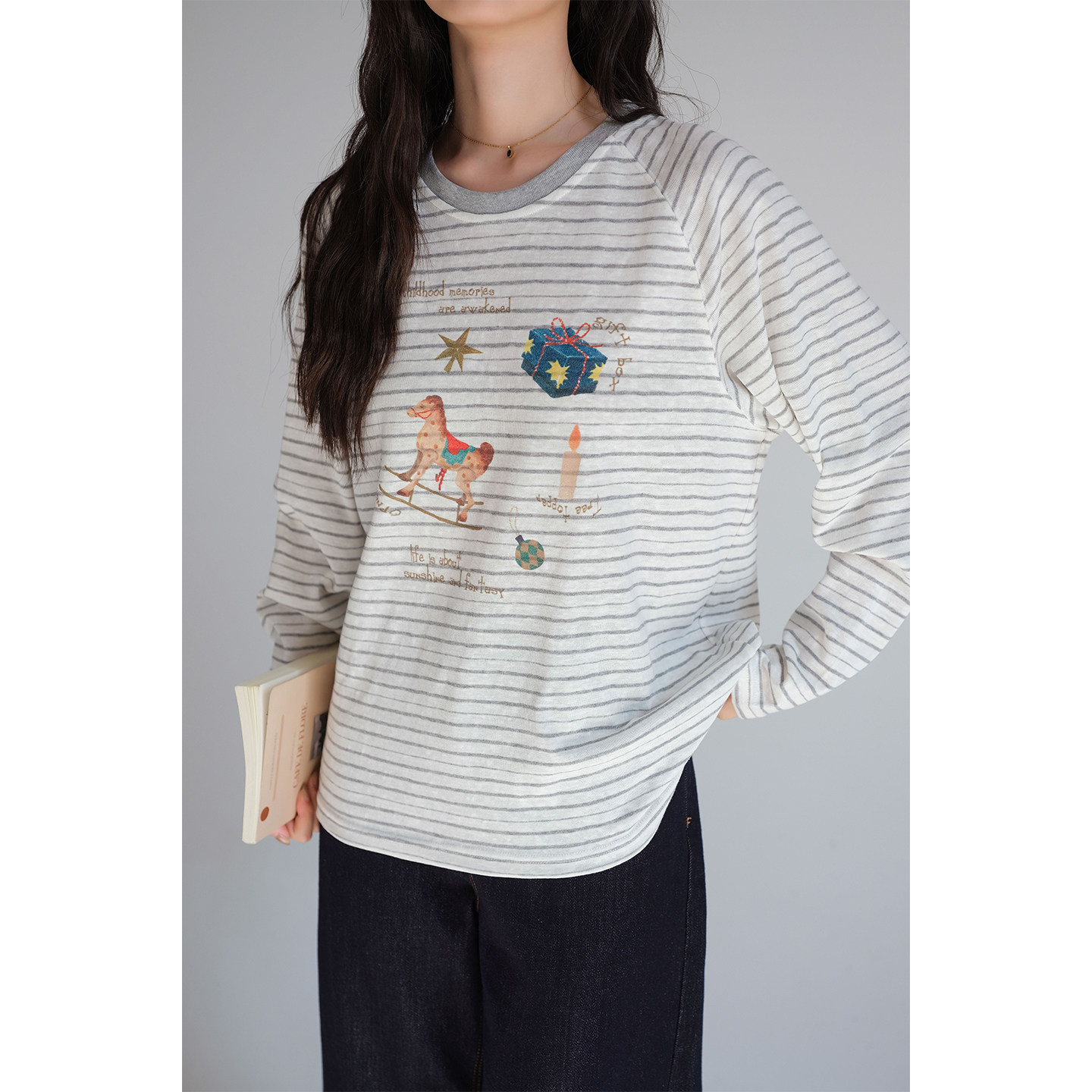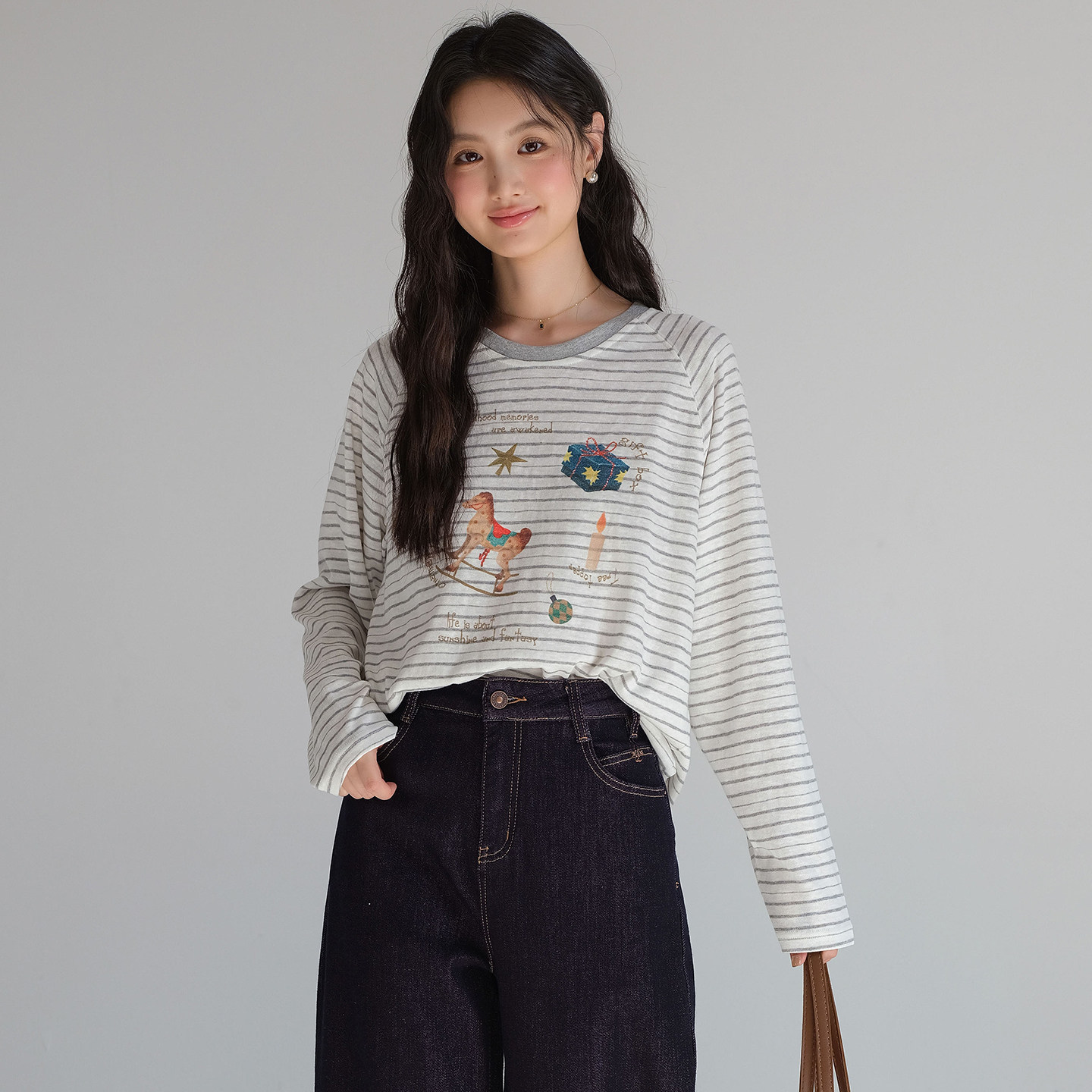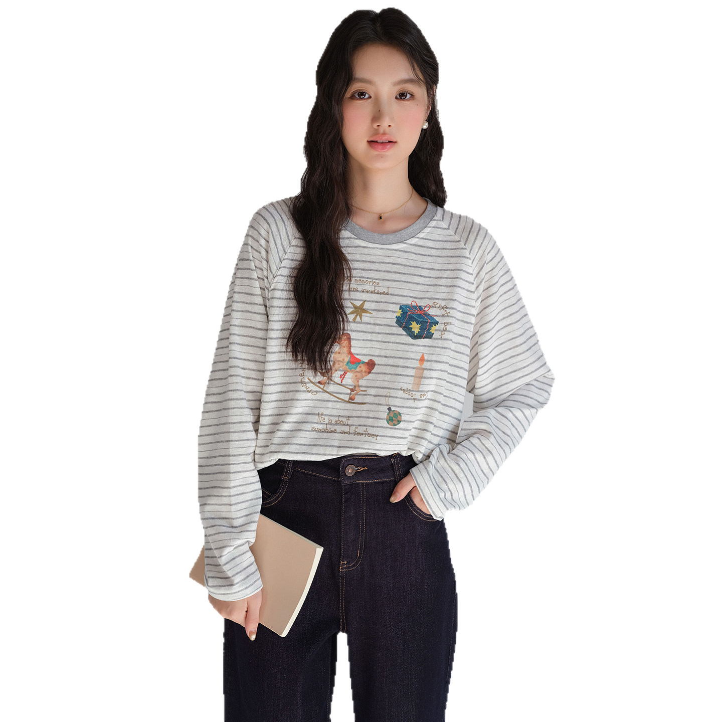 【卡通印花条纹长袖T恤】蓝若水大码2026春装新款遮肚子减龄上衣