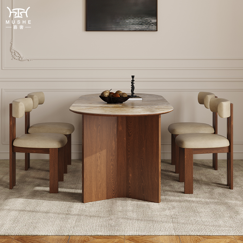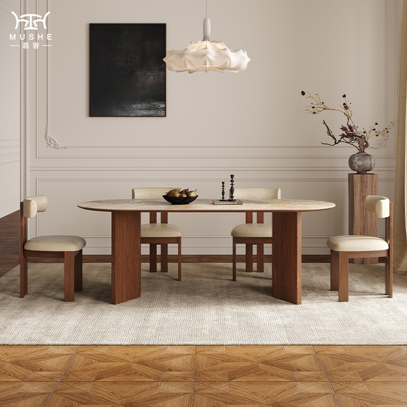 暮奢法式复古实木岩板餐桌椅组合简约椭圆形设计师原创中古风餐桌