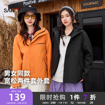 三福加厚外套2025新款冬季连帽摇粒绒内胆户外情侣两件套外套女装