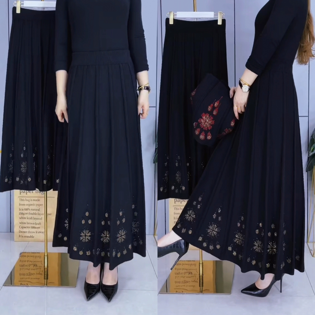 羊毛针织半身裙女秋冬2025新款a字钻花边大摆高腰显瘦中长百褶裙