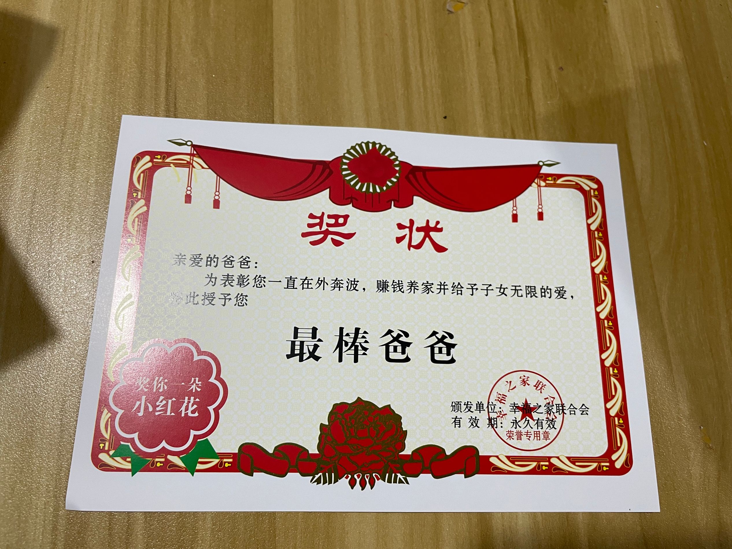 网红送爸爸父亲节奖状感谢信创意礼物最棒爸爸证书老公女朋友礼品