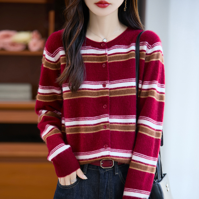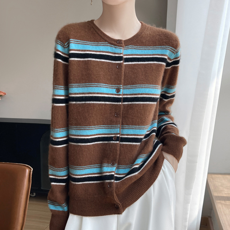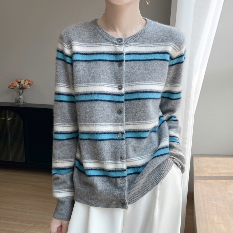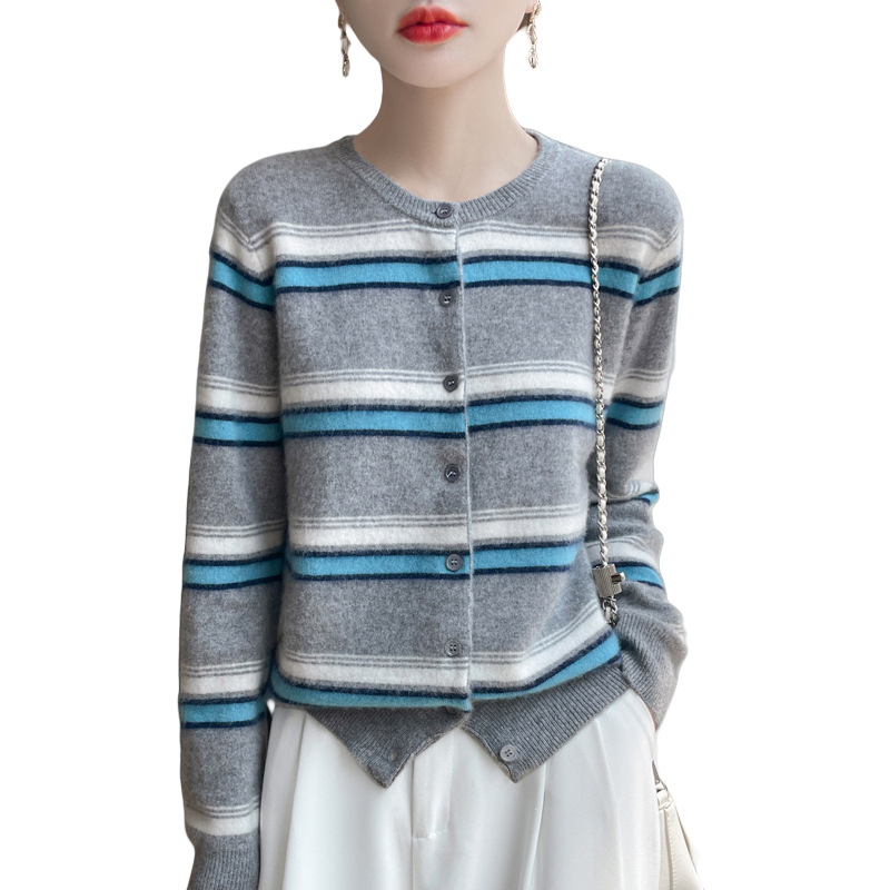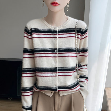 新款条纹软糯纯羊毛衫外套女长袖时尚休闲女装上衣圆领针织衫开衫