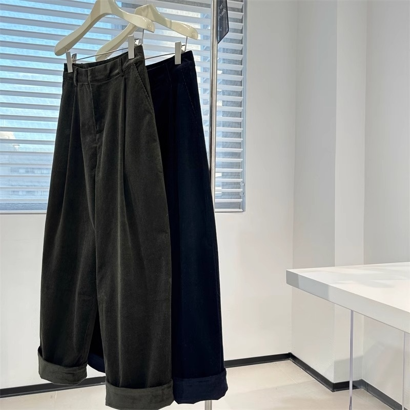 杭州四季青爆款墨绿色灯芯绒阔腿裤子女高腰宽松直筒翻边休闲裤冬