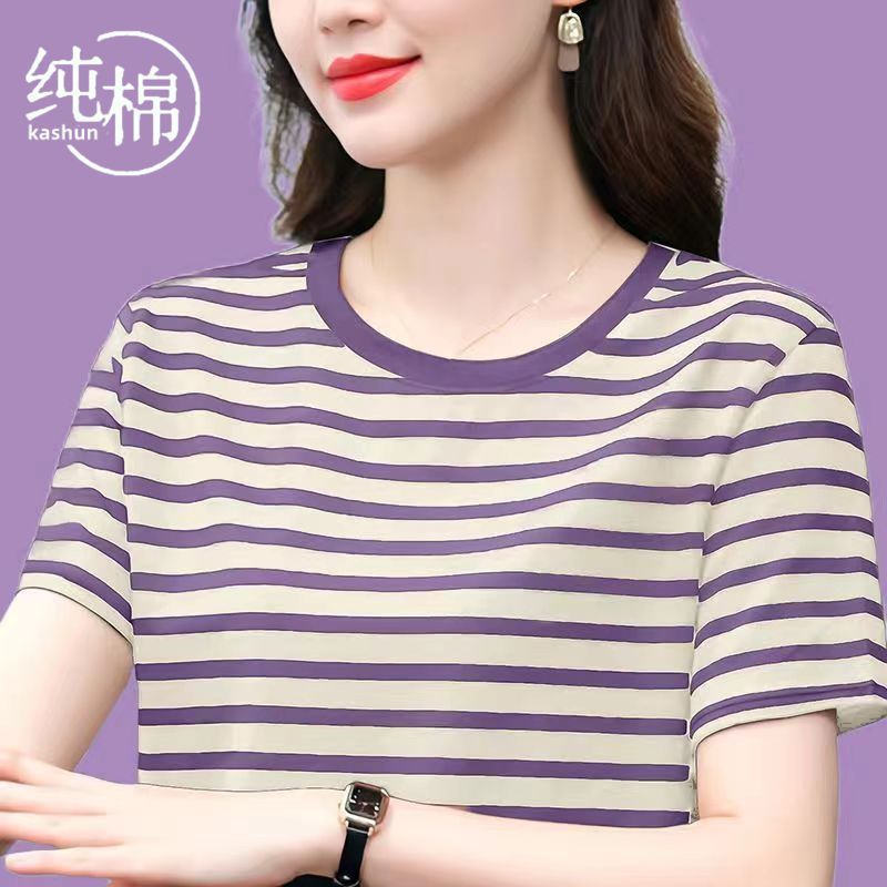 纯棉短袖T恤女士新款夏季妈妈装宽松条纹半袖洋气大码百搭上衣服