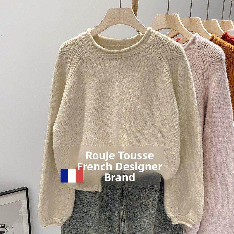Rouje tusse白色圆领套头羊绒毛衣女秋冬季打底针织衫羊毛上衣潮