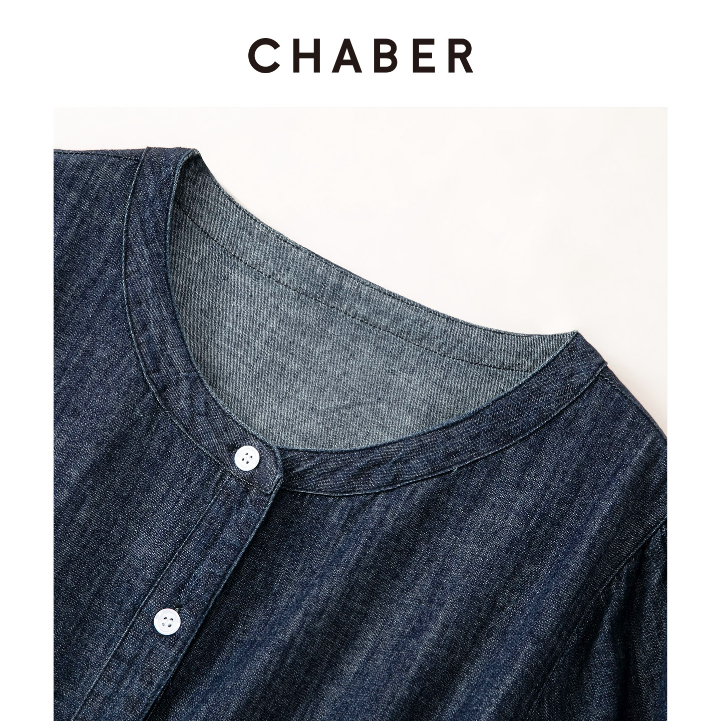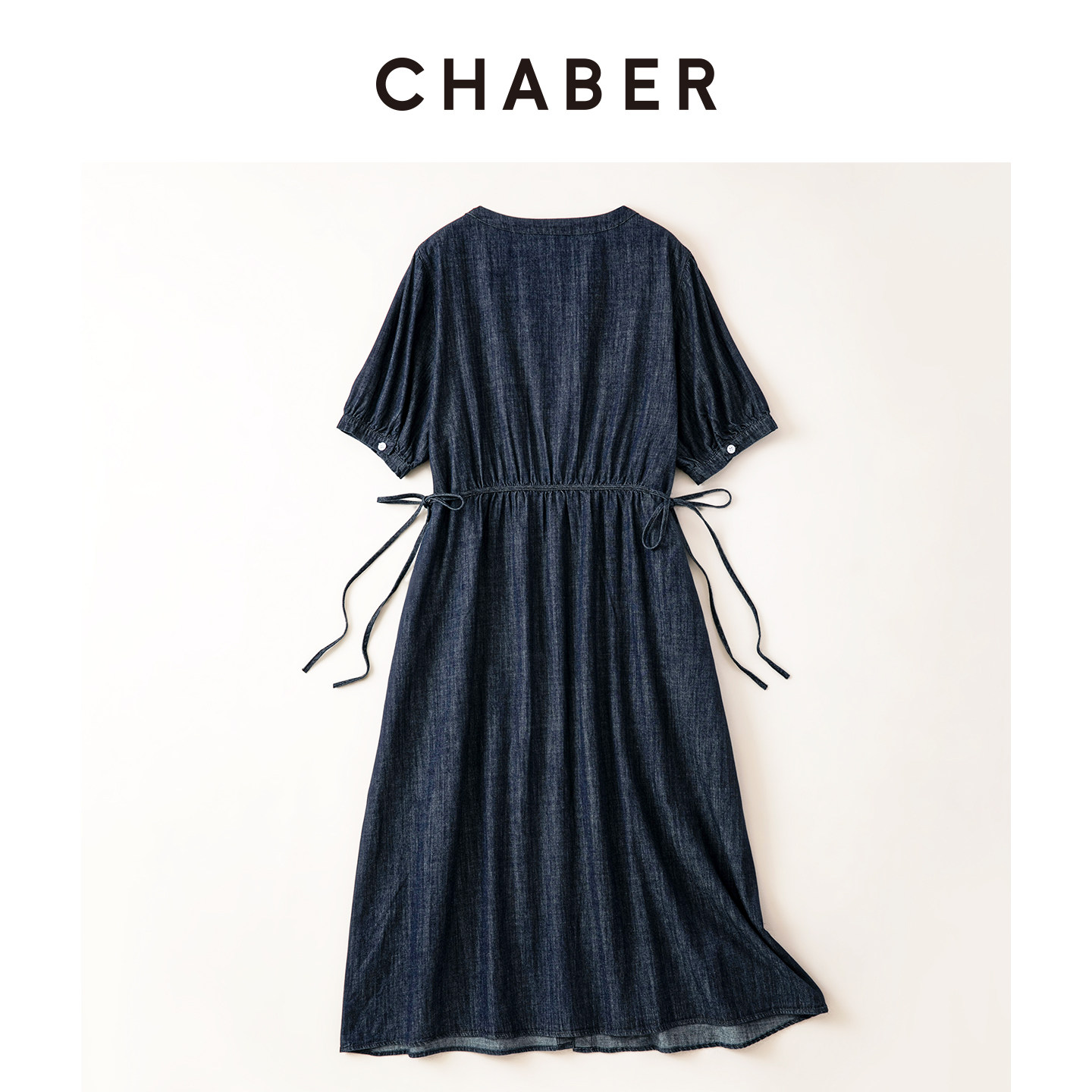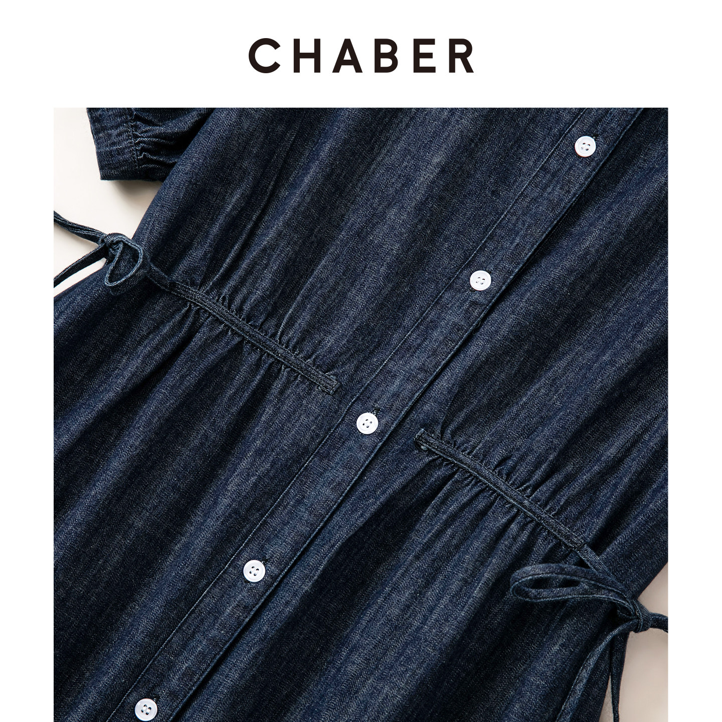 CHABER巧帛早秋新款圆领短袖连衣裙时尚系带收腰宽松休闲女牛仔裙