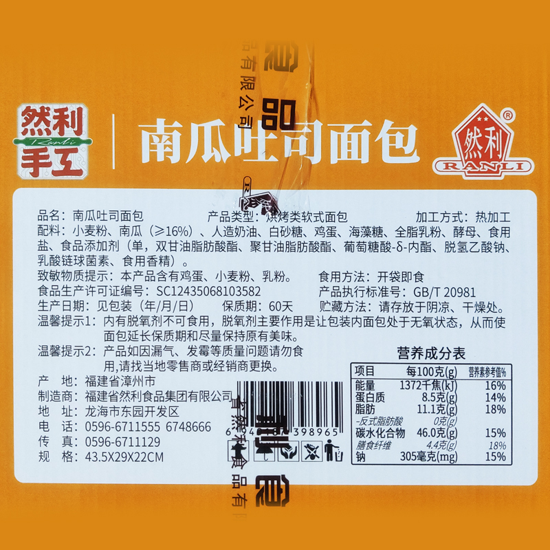 【旗舰】然利手工南瓜吐司面包原味手工面包早餐零食糕点120g/袋