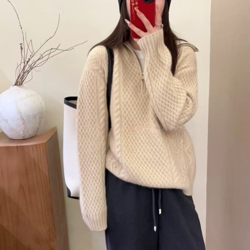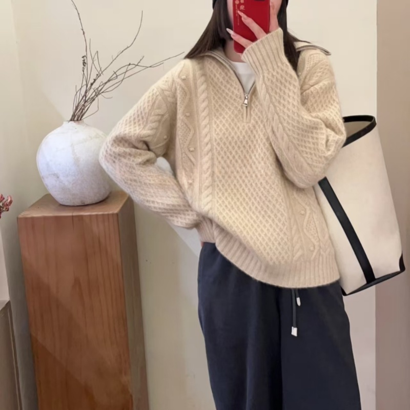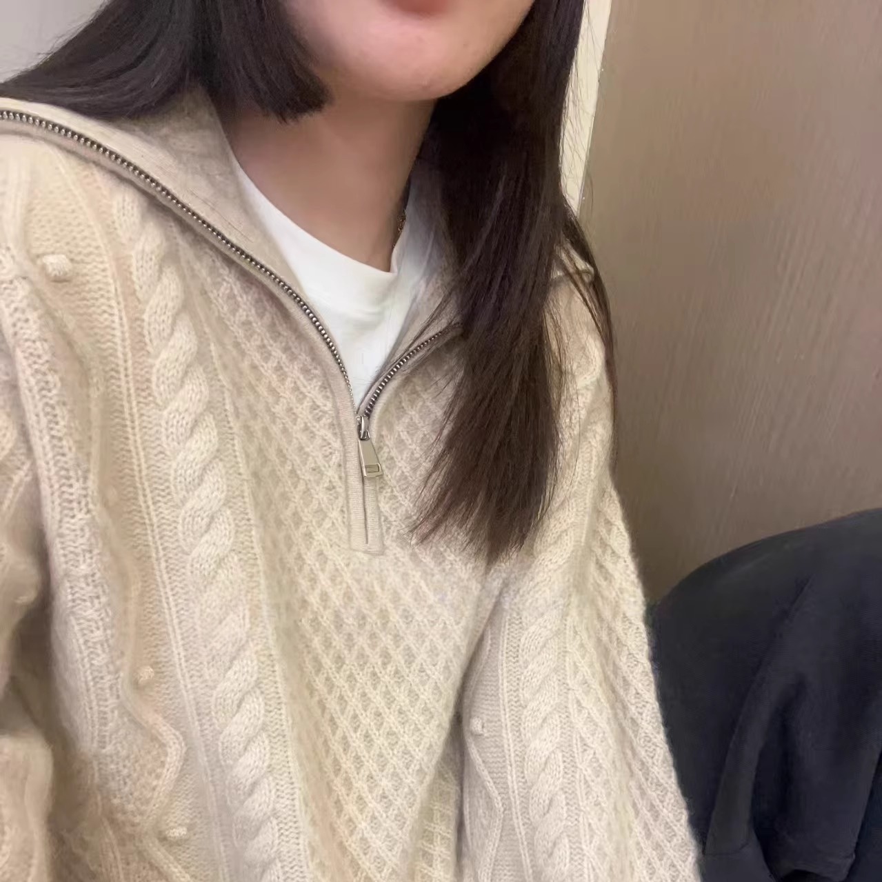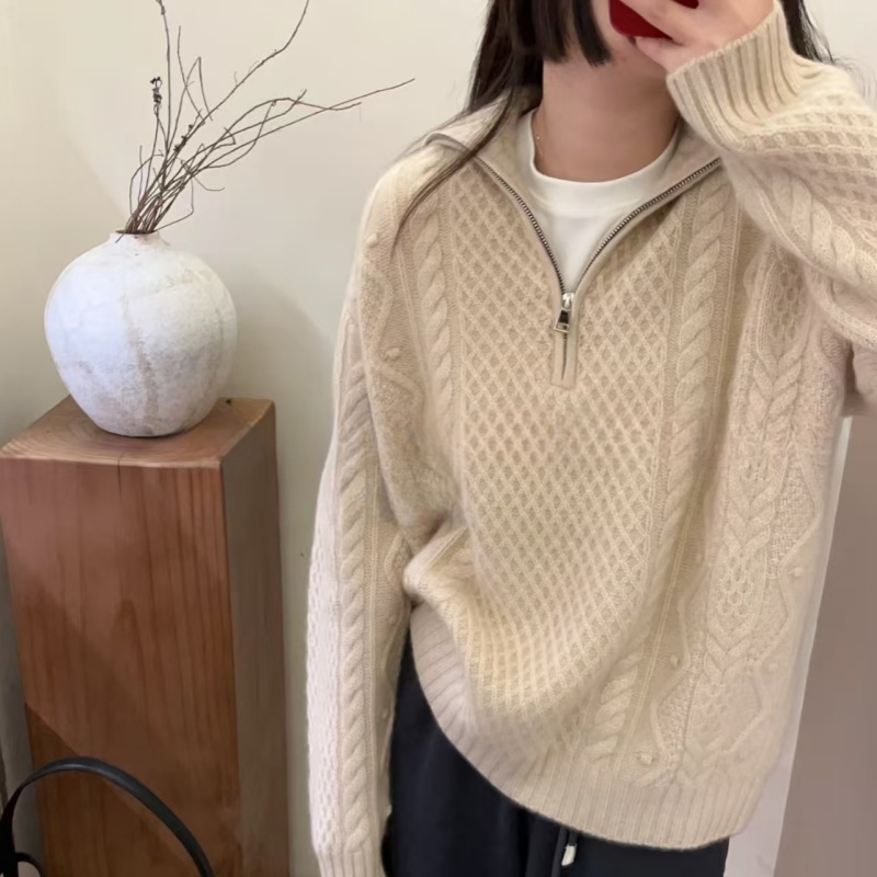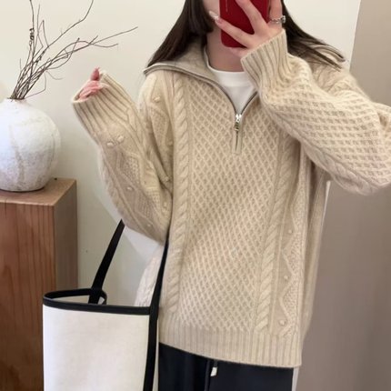 重磅加厚~秋冬新款山羊绒衫女半拉链翻领宽松显瘦针织打底衫毛衣