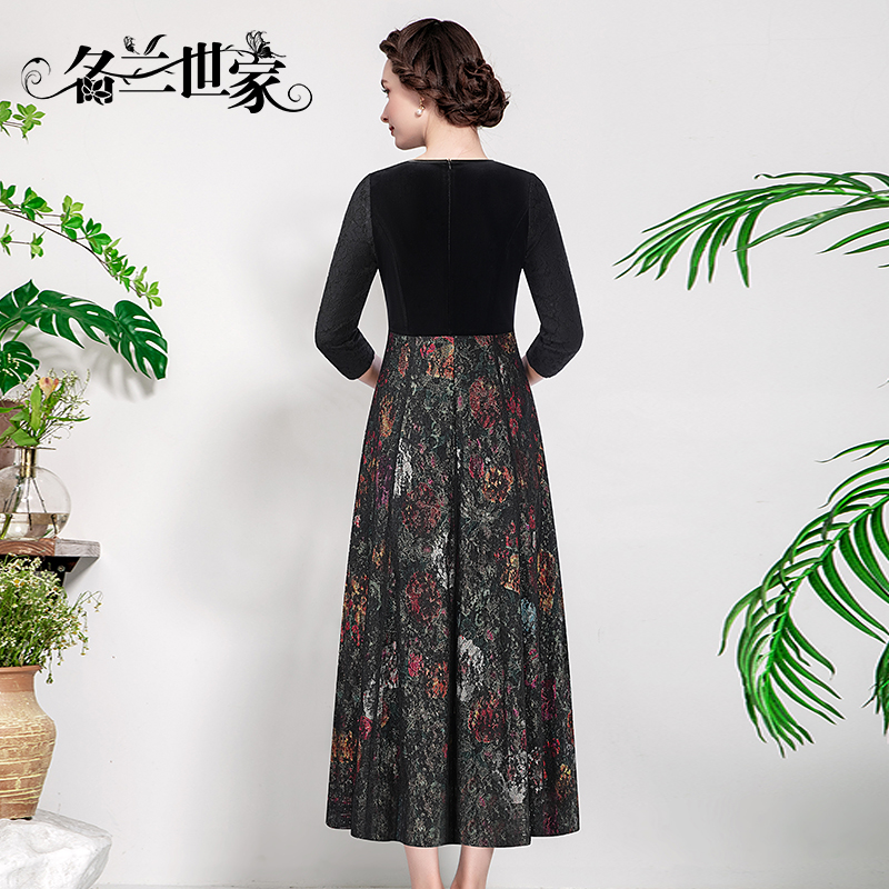 名兰世家原创设计师品牌宴会礼服裙丝绒圆领中长款显瘦印花连衣裙