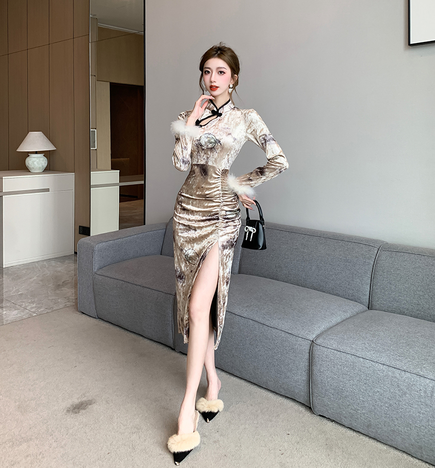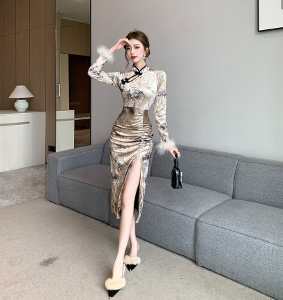 秋冬新款复古国风年轻款改良式收腰褶皱开叉长款旗袍花色女连衣裙