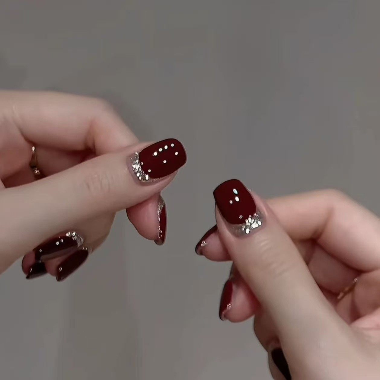 酒红碎金纯手工短款穿戴甲显白