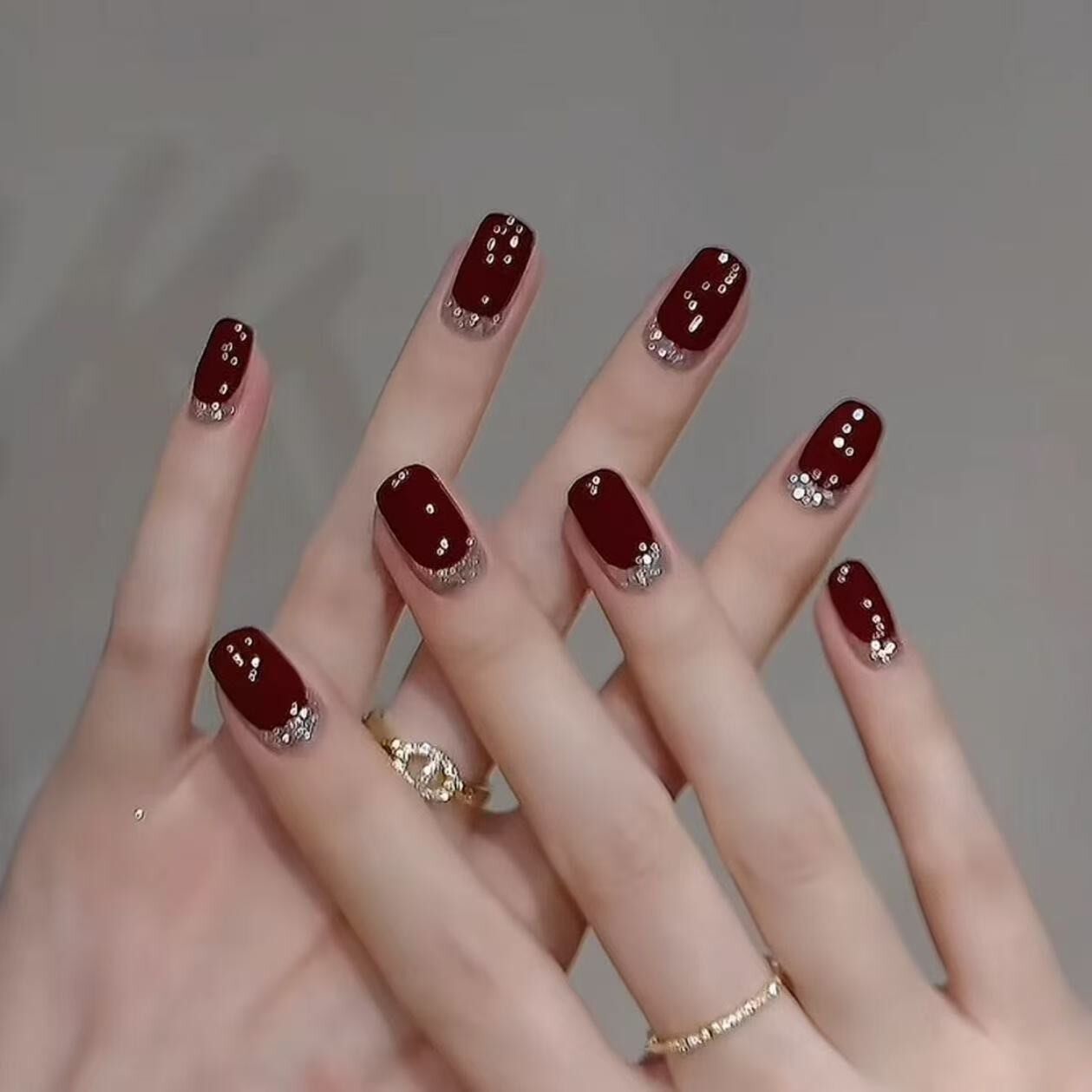 【酒红碎金】纯手工穿戴甲春夏短款纯色美甲温柔显白车厘子红可拆