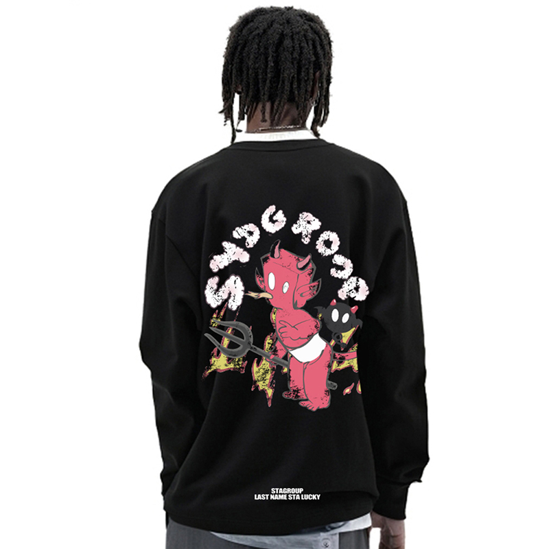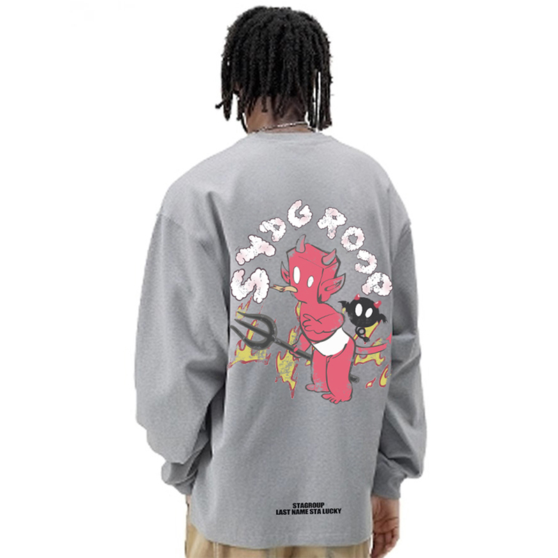STA美式复古小恶魔涂鸦长袖T恤男女街头潮牌休闲重磅纯棉打底衫