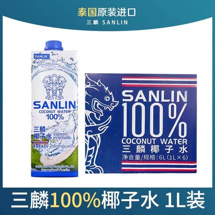 泰国三麟100%天然纯椰子水进口饮料NFC椰青水果汁饮品1L*6瓶整箱