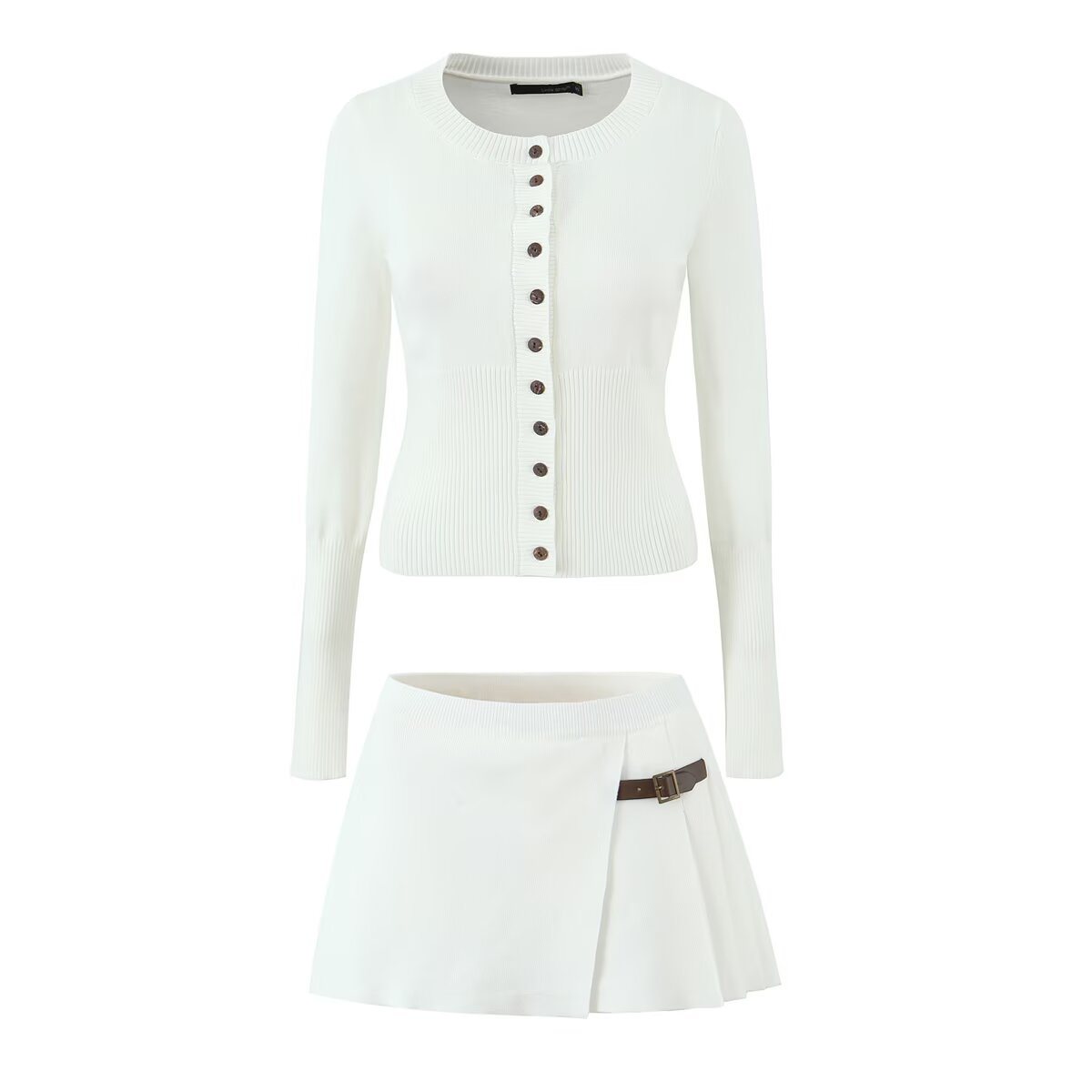 小谷姿秋冬圆领前排扣长袖针织衫腰带扣装饰百褶休闲半身裙两件套