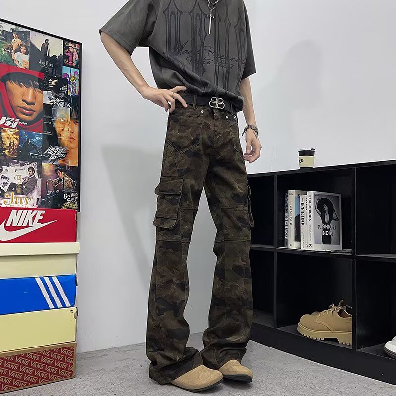 2025夏季新款美式复古迷彩多口袋修身工装裤嘻哈直筒显瘦微喇裤男