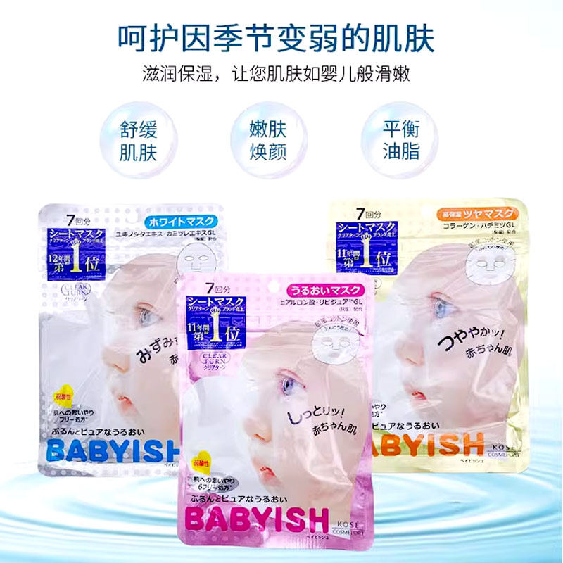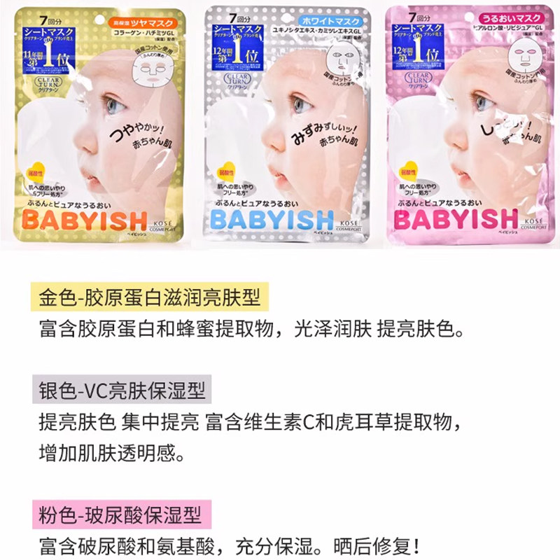 日本Kose高丝babyish婴儿肌玻尿酸 白皙保湿亮肤面膜三款选 7片装