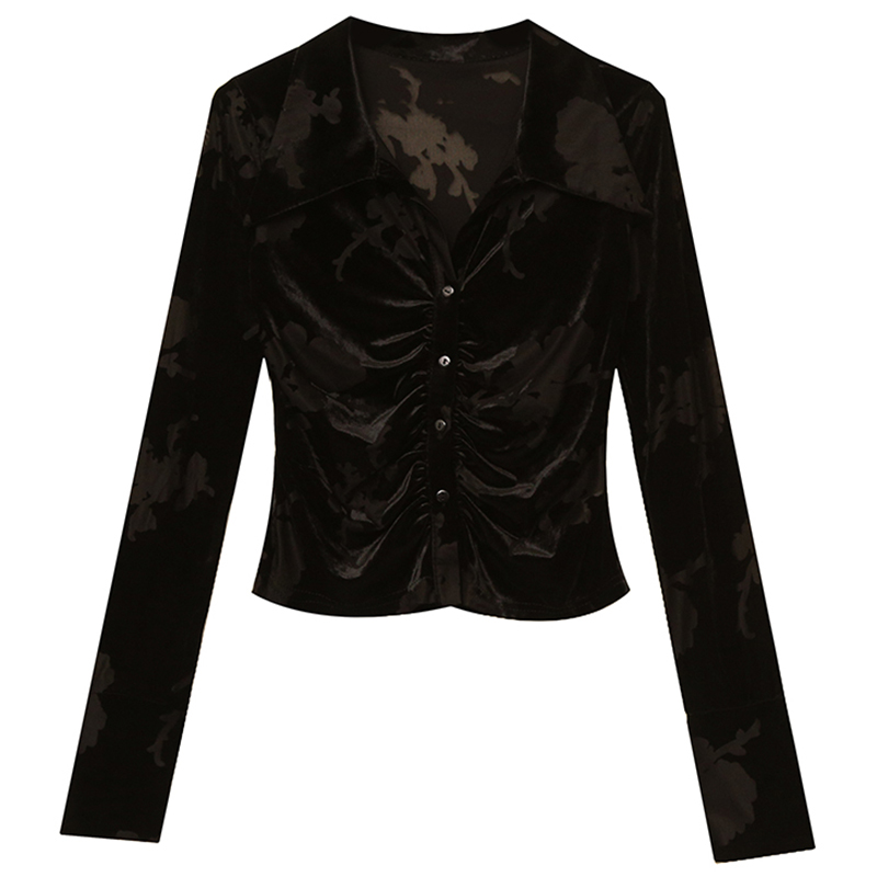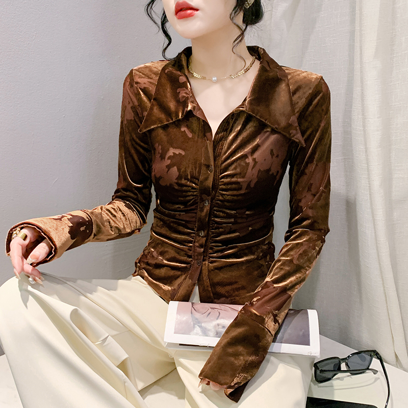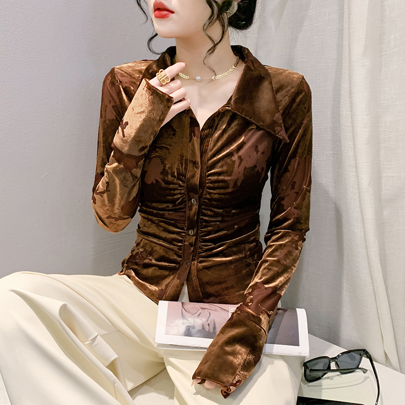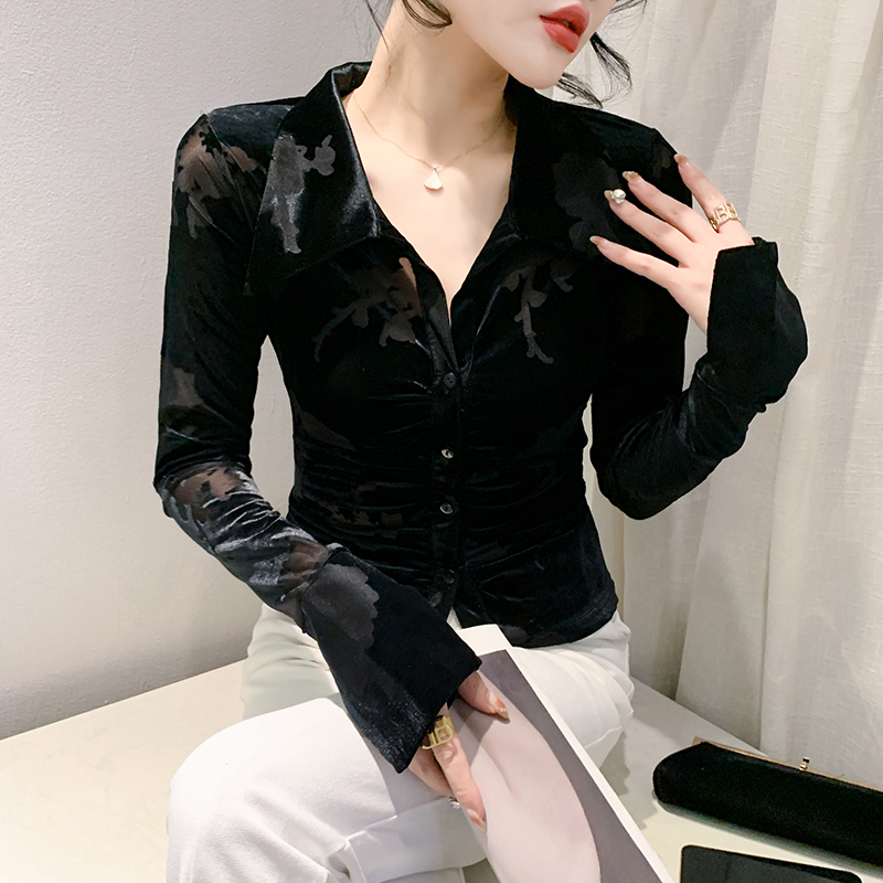 2025秋冬新款时尚POLO领衬衫女长袖欧货植绒网纱上衣修身显瘦衬衣