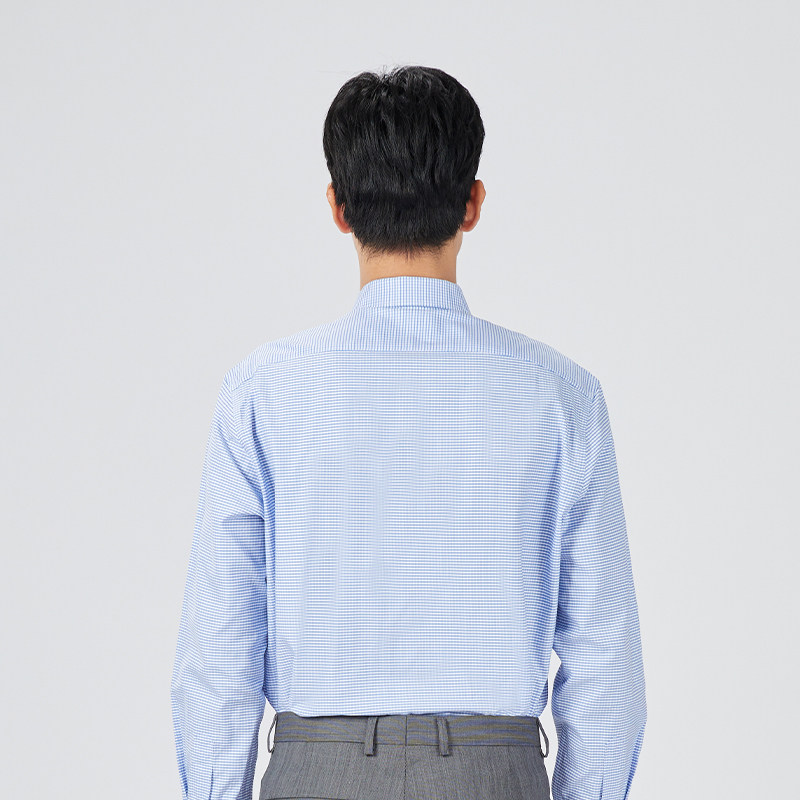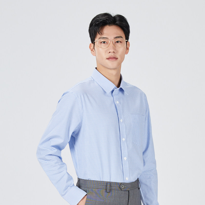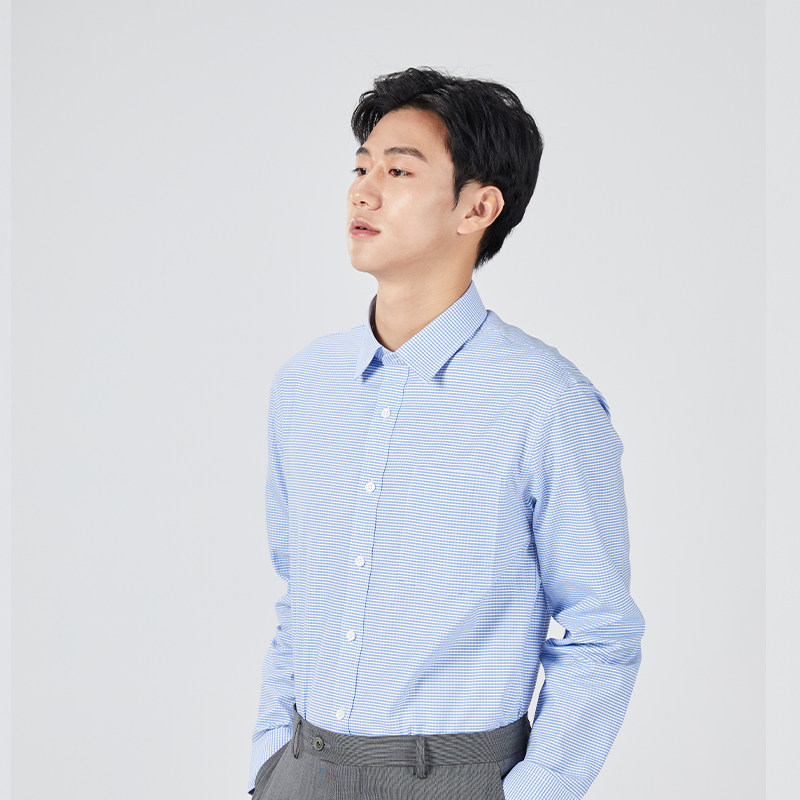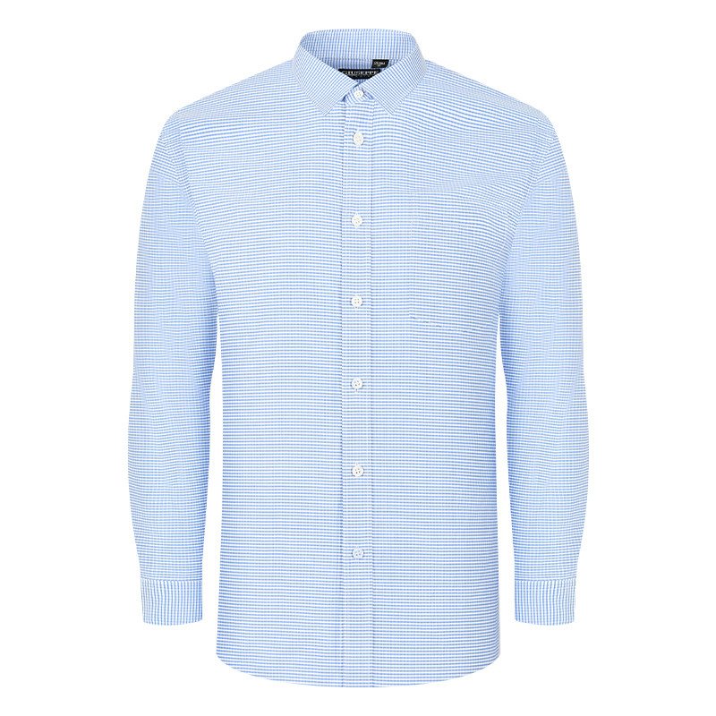 乔治白男士春秋商务长袖衬衫尖领蓝色细格直筒休闲宽松衬衣有口袋