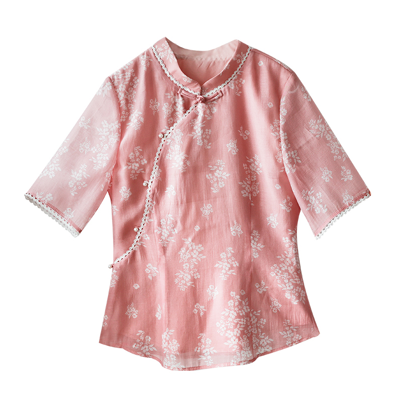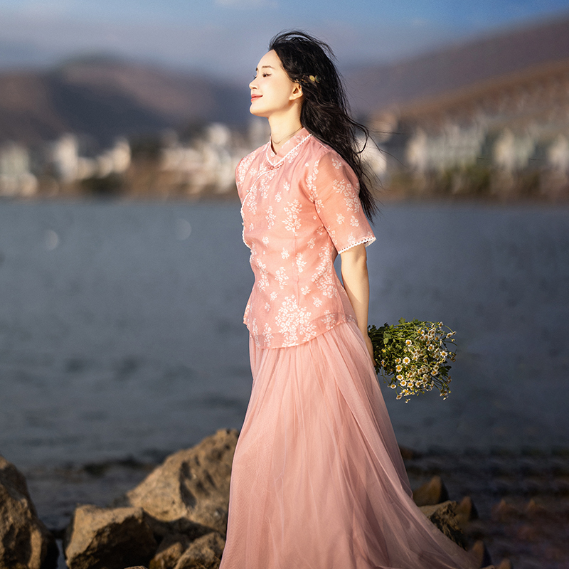现货【镜花瑶】欧根纱印花中式开衫女夏偏门襟蕾丝花边网纱半身裙