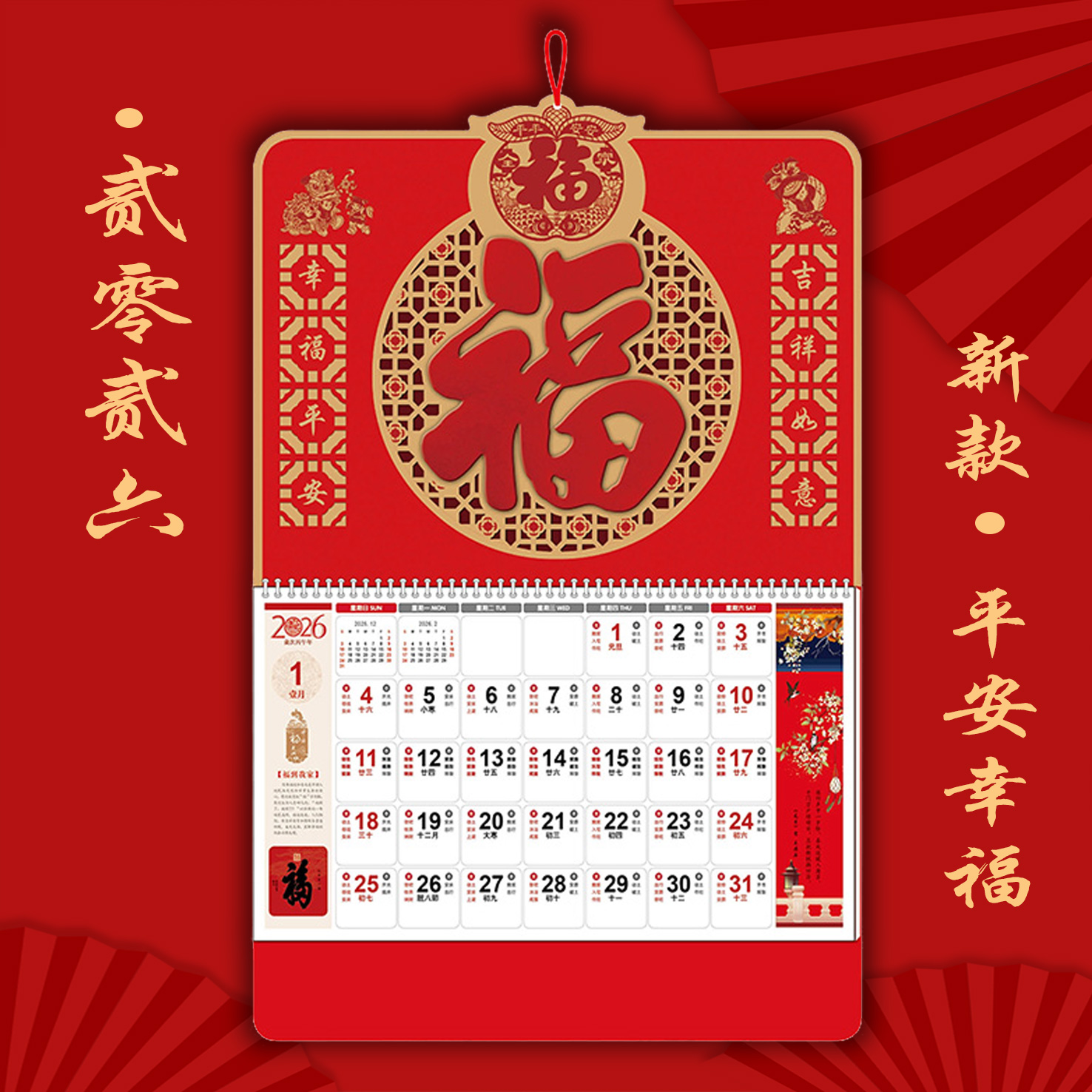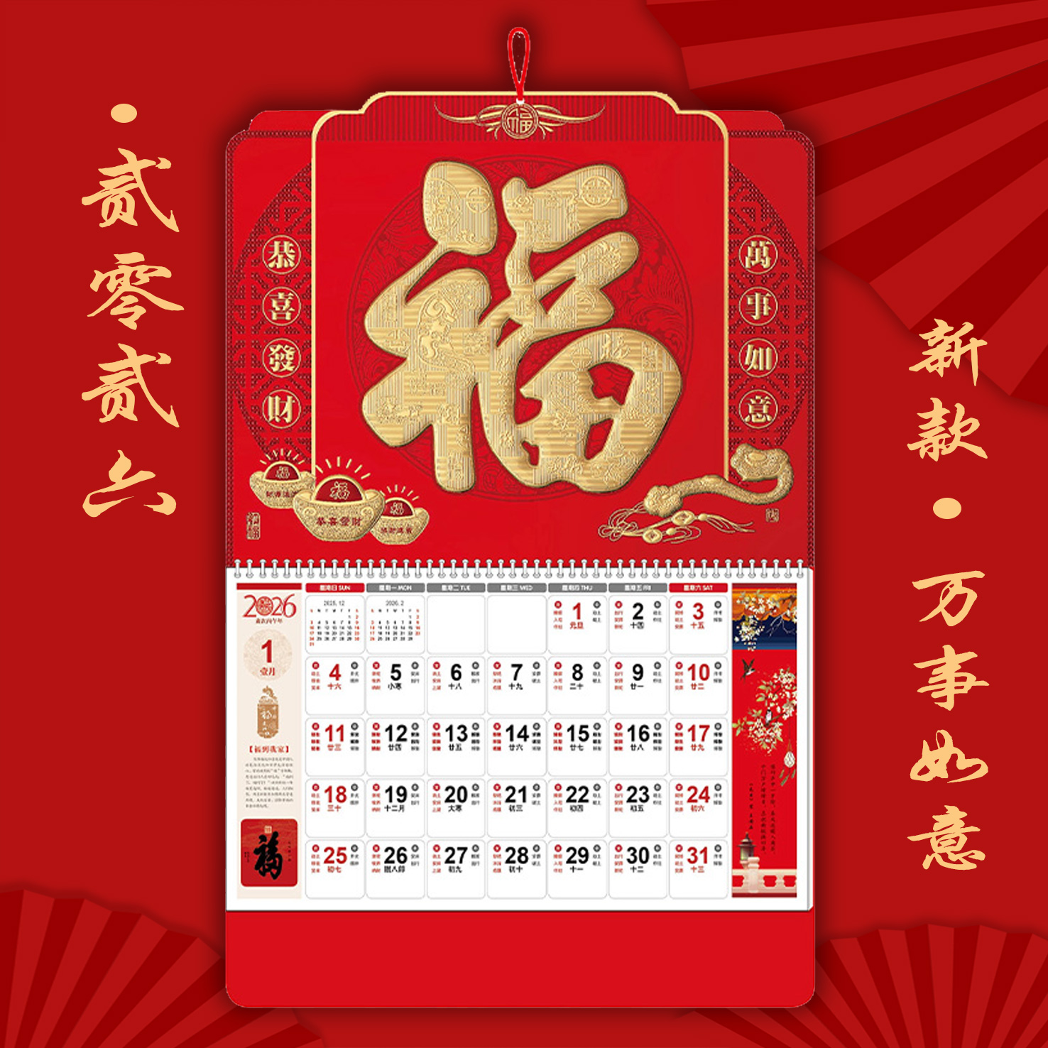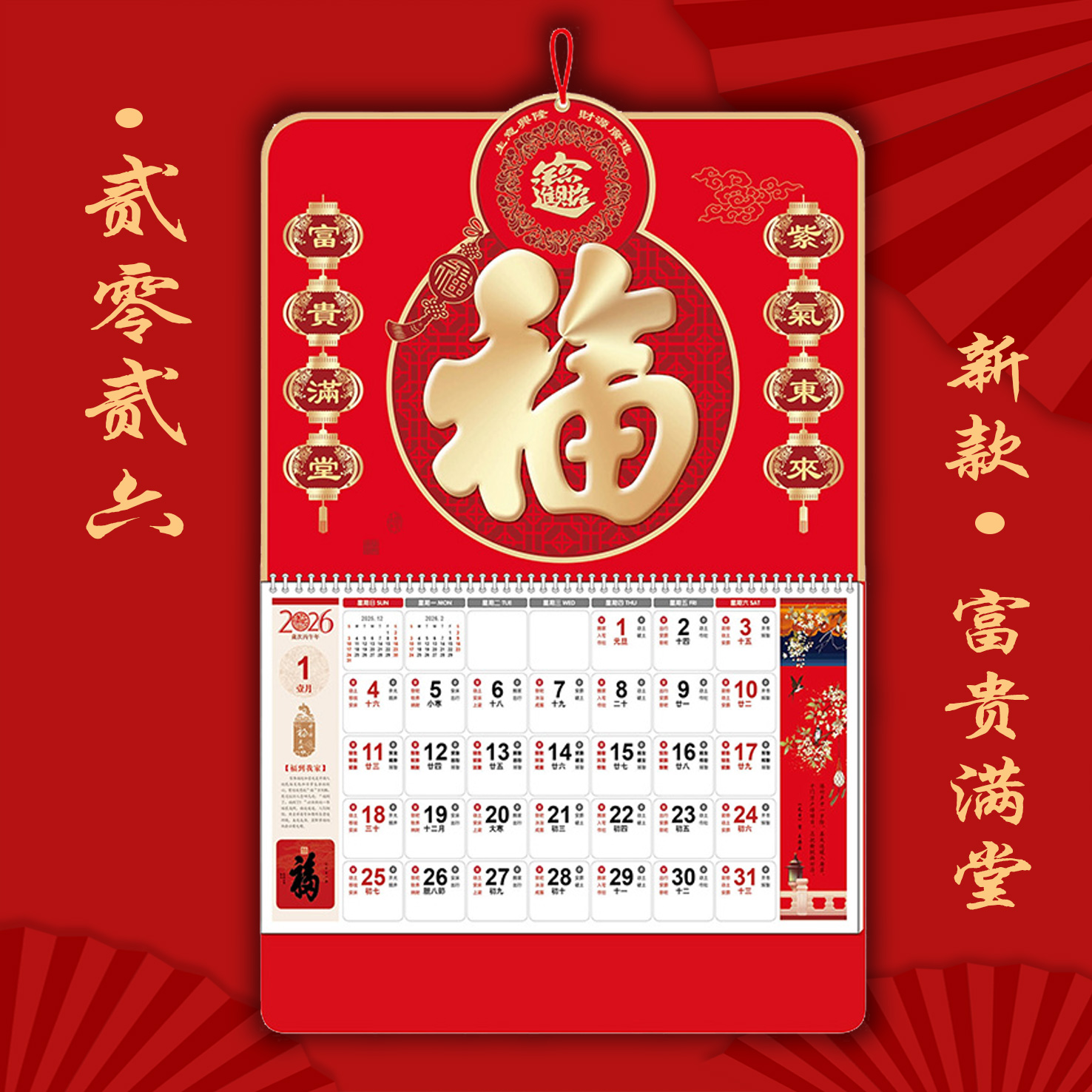 2026马年挂历家用挂墙式加大月历红色中国风大四开广告吊牌挂历