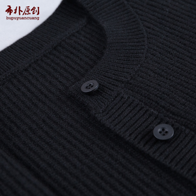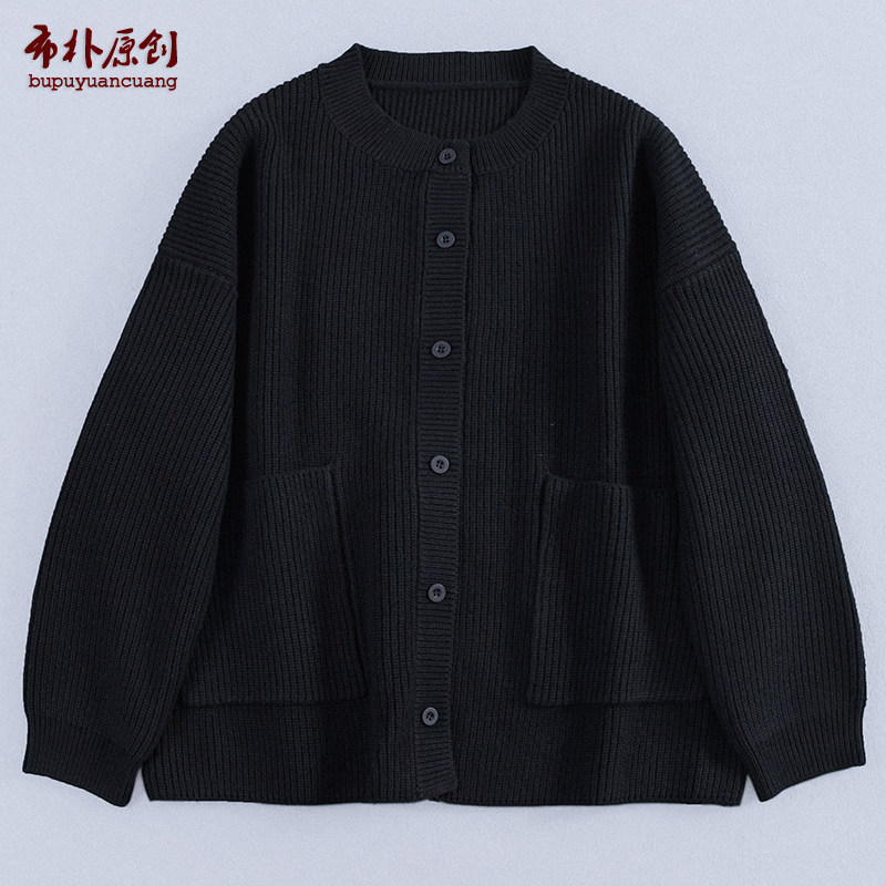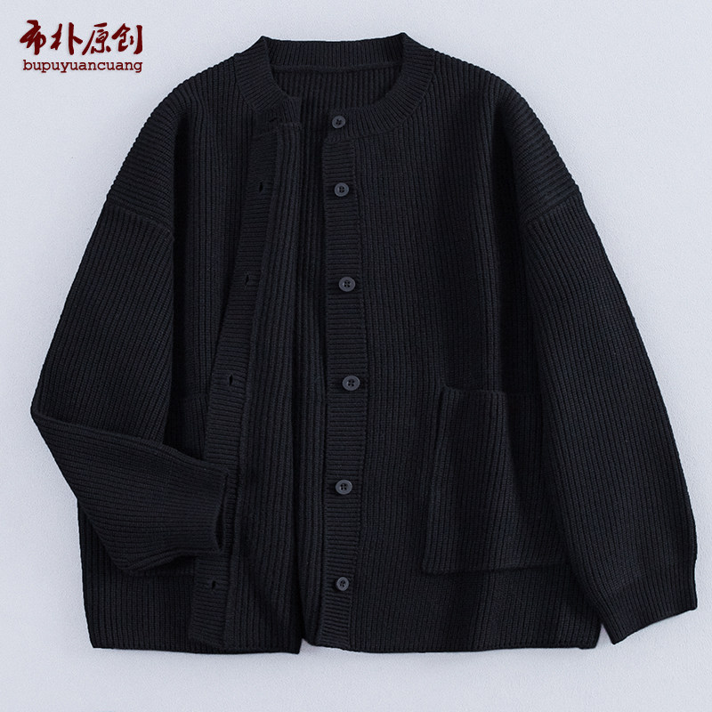 布朴家作2025秋冬款羊毛黑色粗纱元宝针简约开襟加厚圆领毛衣外套