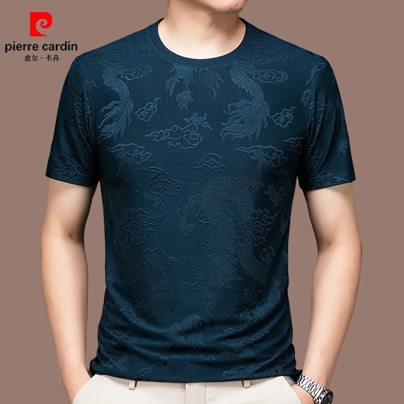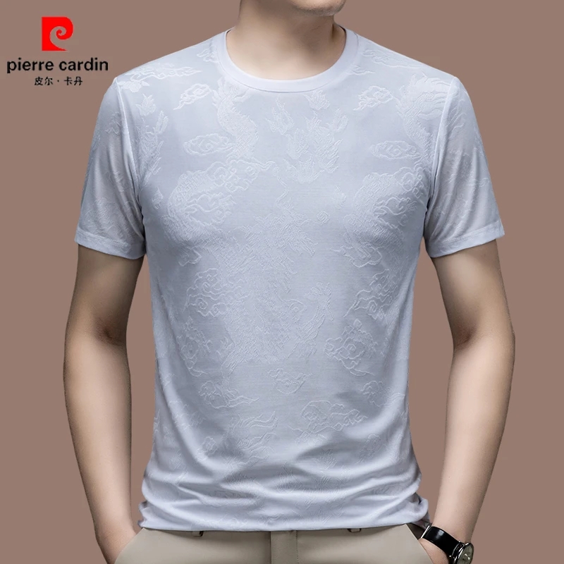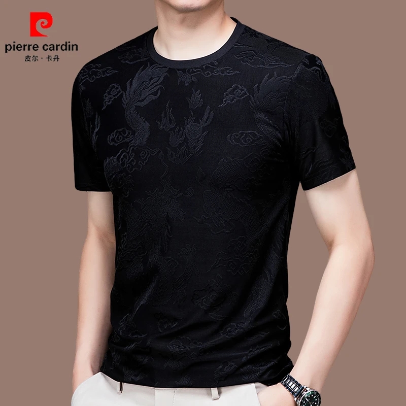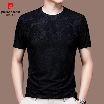 皮尔卡丹高端男士桑蚕丝圆领短袖t恤夏季薄款潮流提花休闲体恤衫