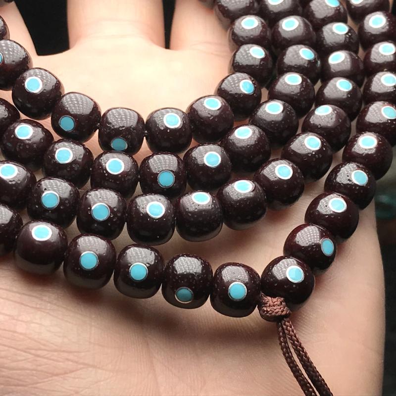 藏传古法朱砂供星月菩提老型桶珠108颗佛珠嵌绿松石多宝万字手串