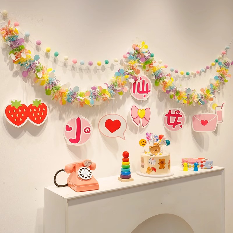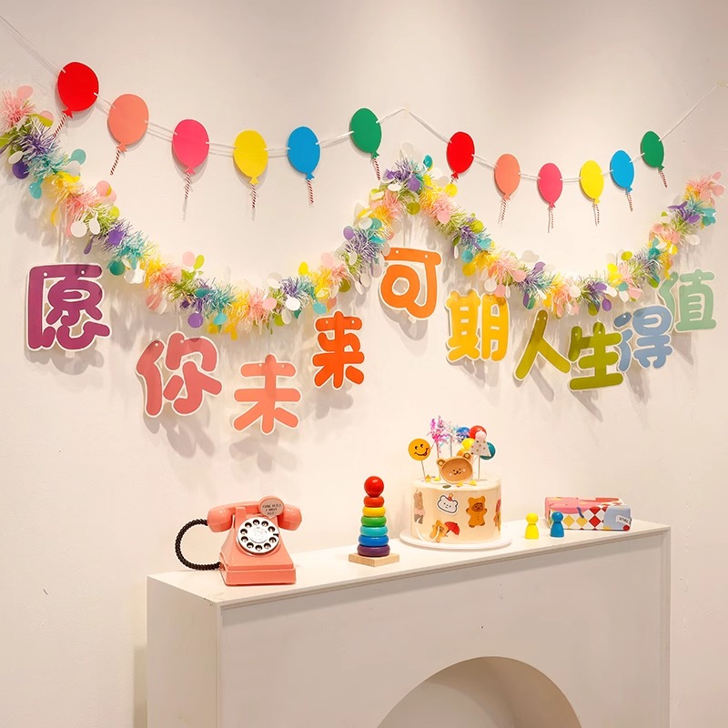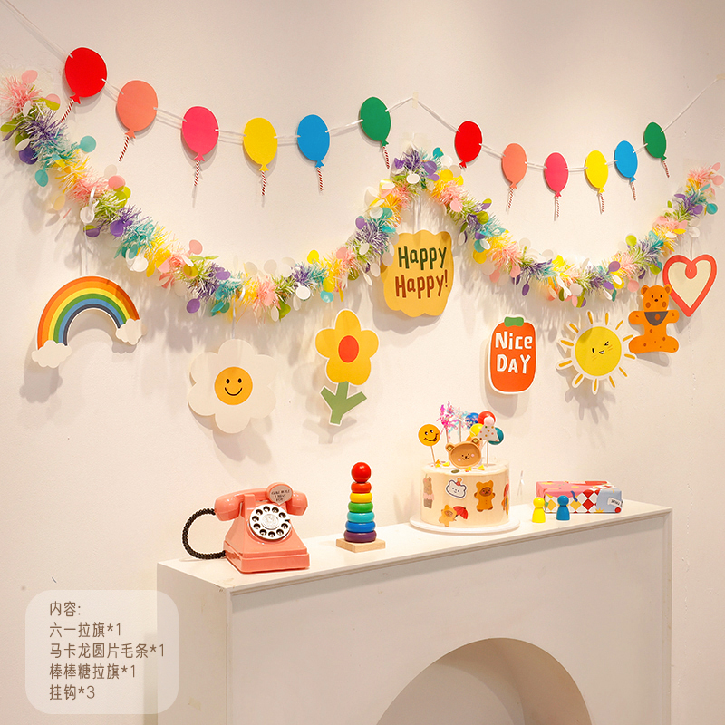 生日场景布置装饰马卡龙毛条拉旗氛围儿童男女孩宝宝周岁拍照道具