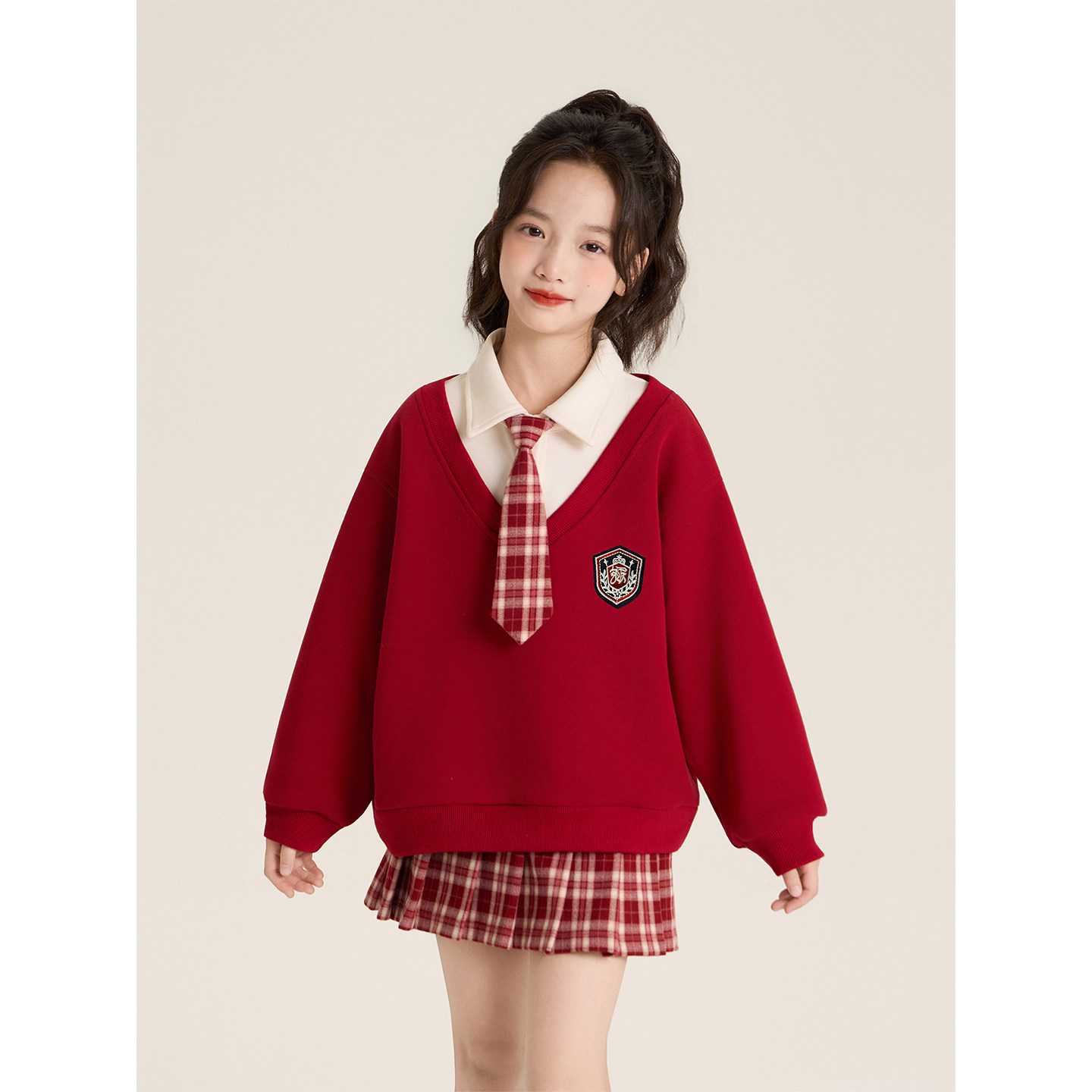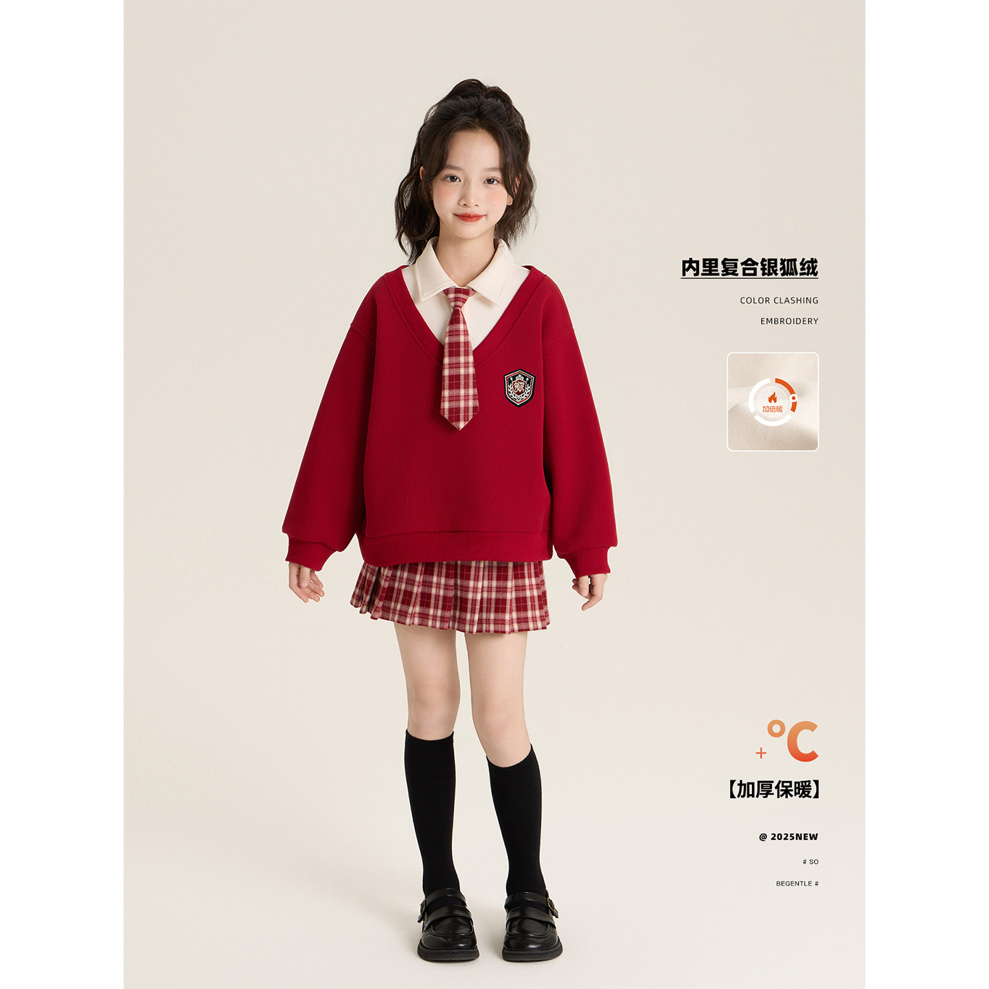 Amybaby女童套装冬季2025新款甜美学院风假两件厚卫衣格子百褶裙