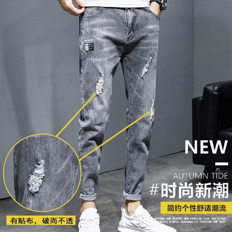 破洞牛仔裤男2022年夏季潮流韩版潮牌直筒宽松修身小脚休闲长裤子