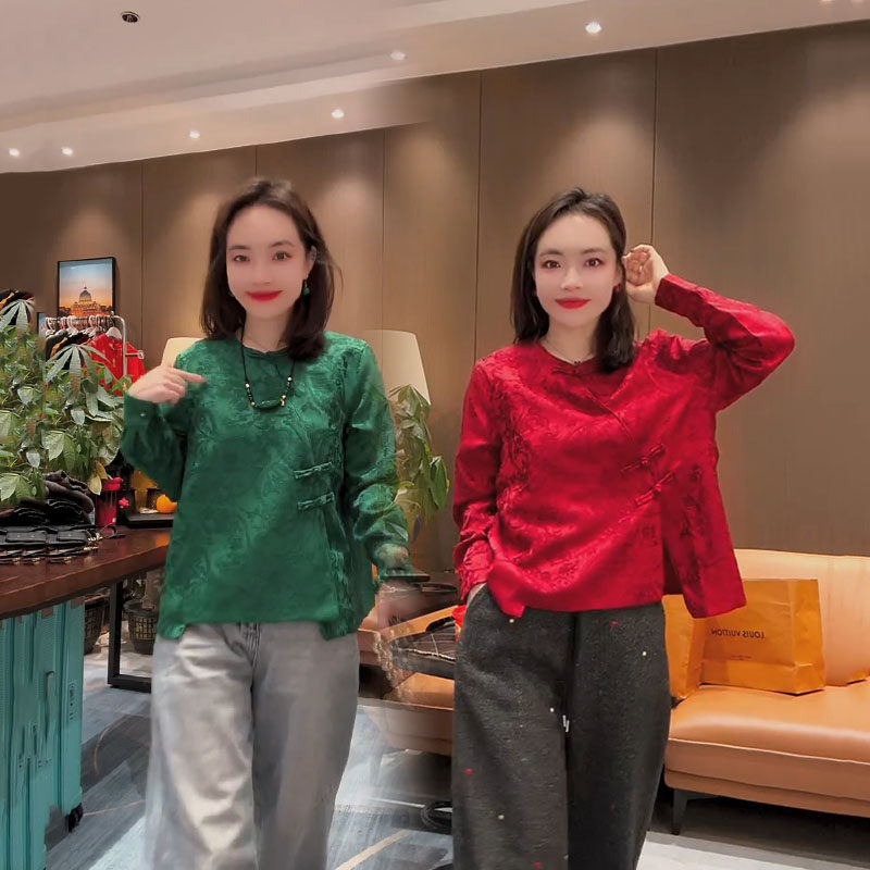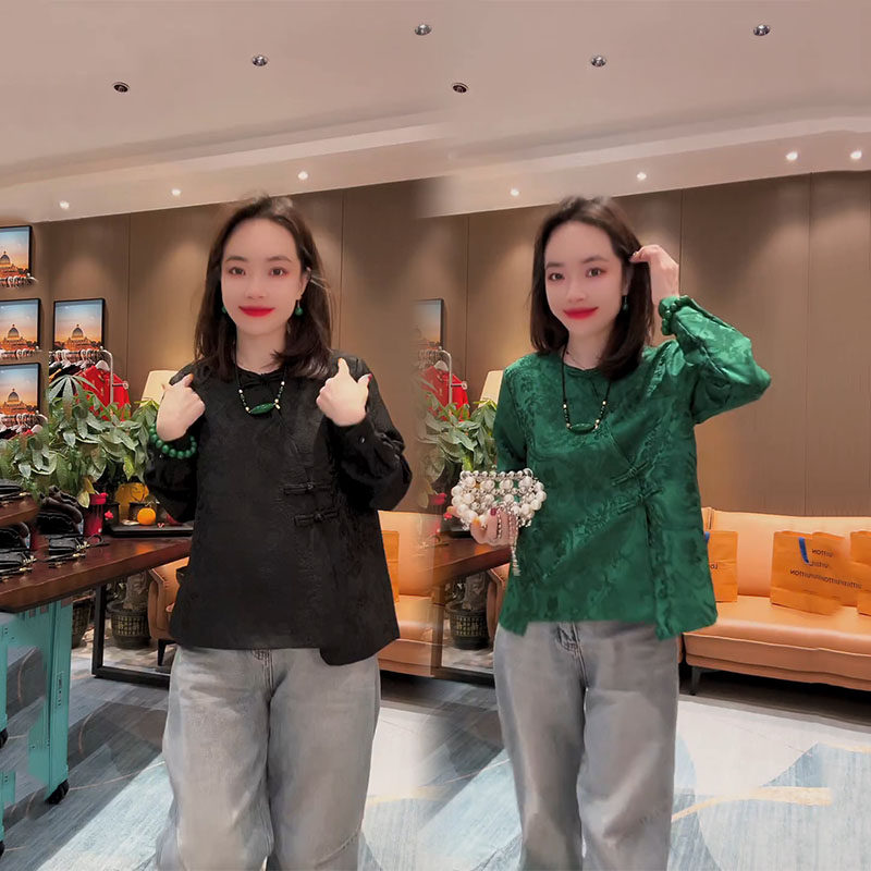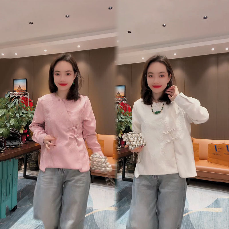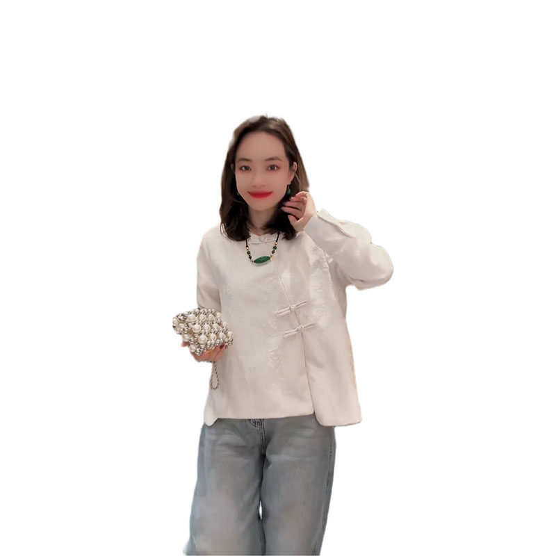新中式国风衬衫女2025早春新款纯色提花盘扣设计宽松显瘦圆领上衣