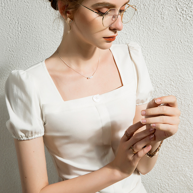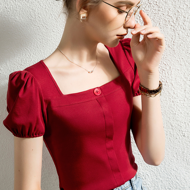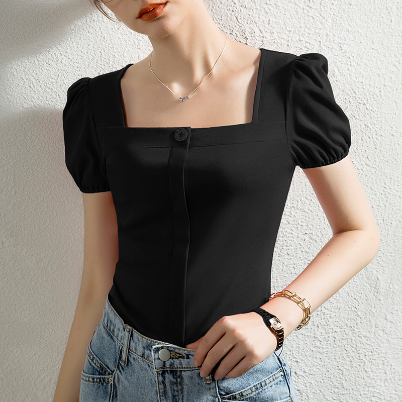 法式复古方领泡泡袖上衣女短袖夏装纽扣洋气修身女式T恤2025秋季