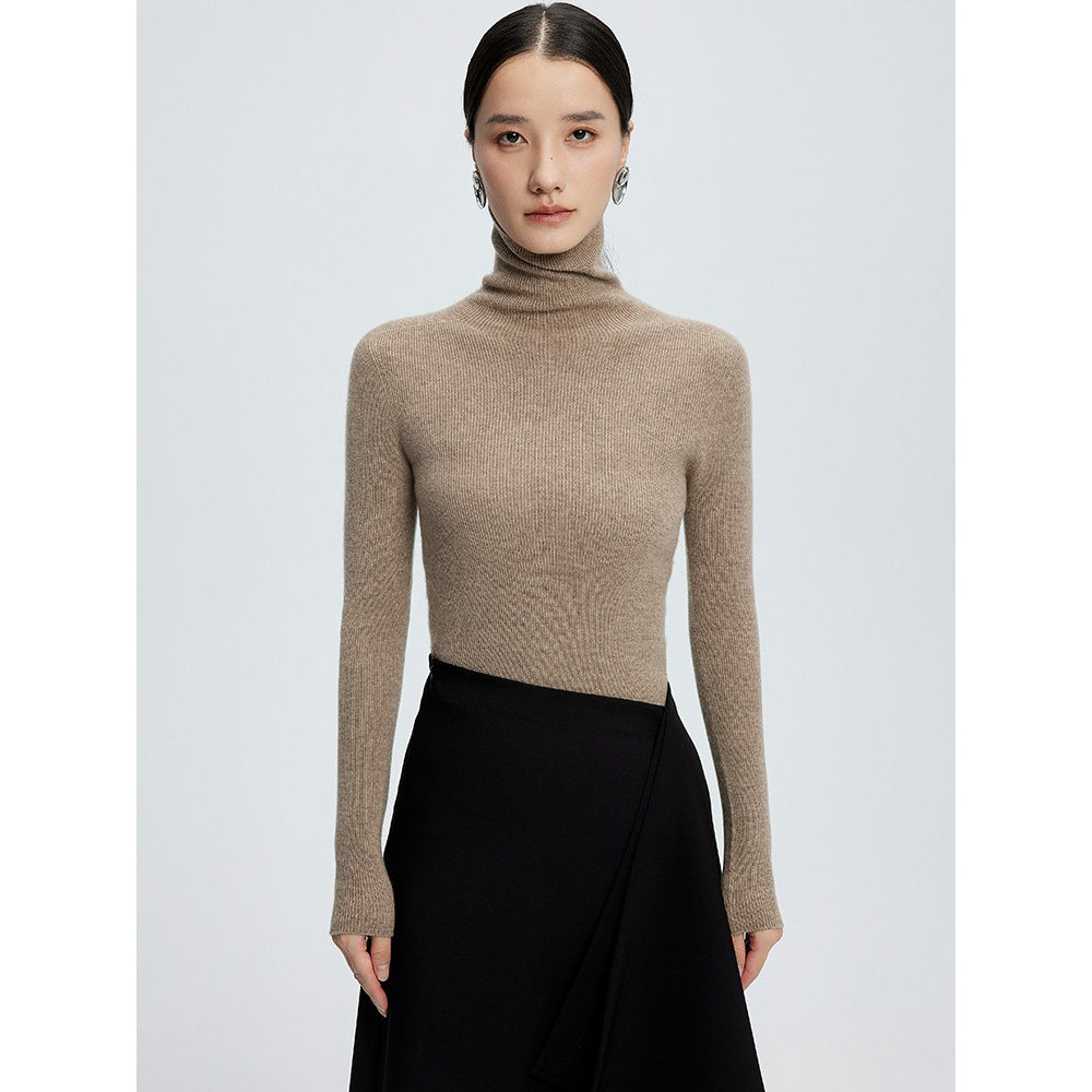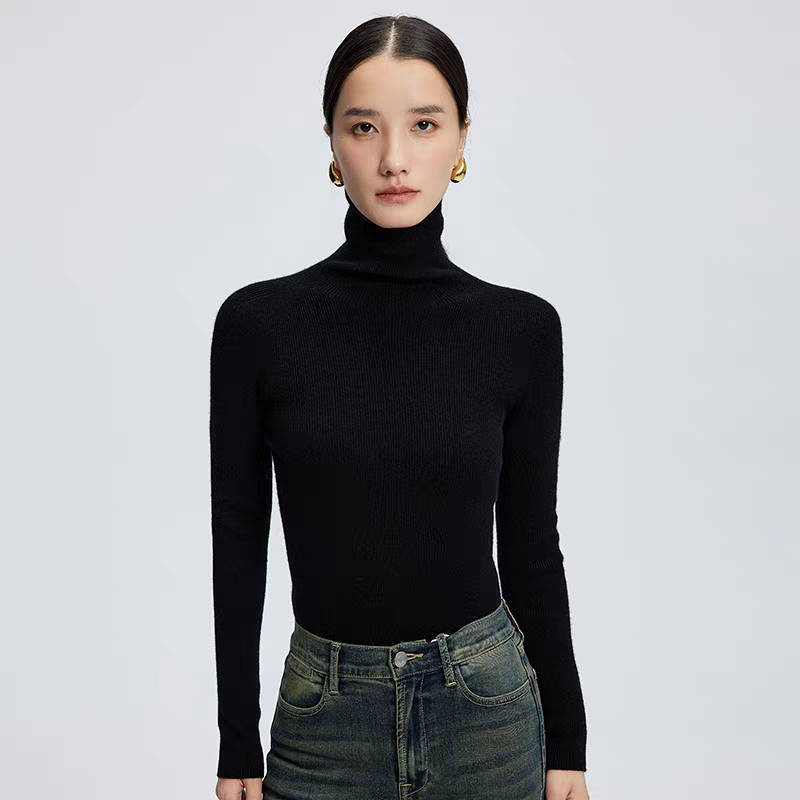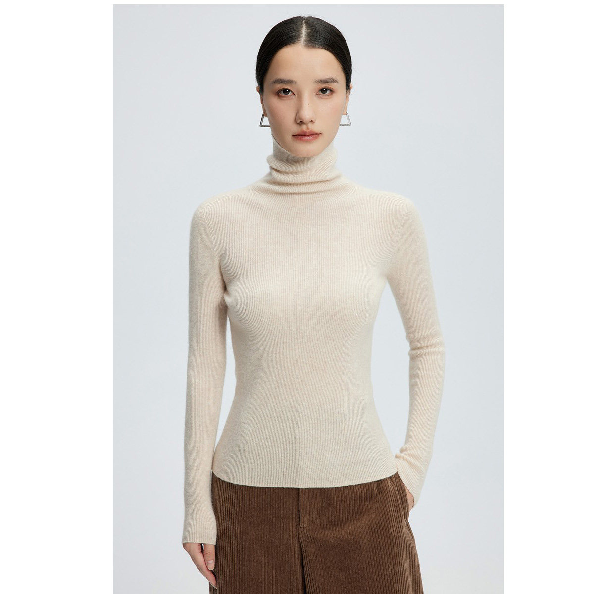 鄂尔多斯市无缝一体纯白色羊毛衫女秋冬堆堆领修身羊绒针织打底衫