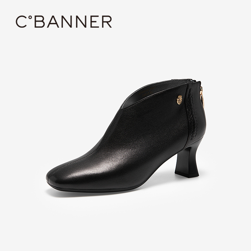 千百度羊皮粗跟装靴女款2025秋冬新款皮靴通勤踝靴方头气质小短靴