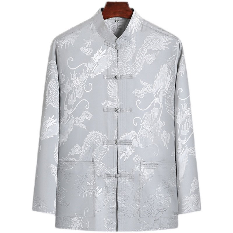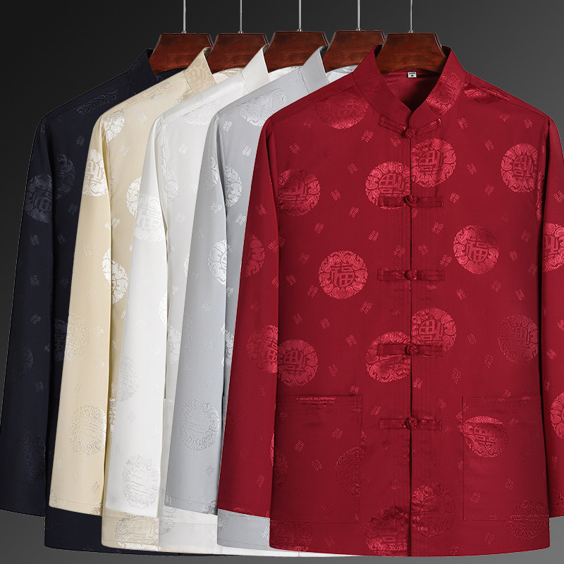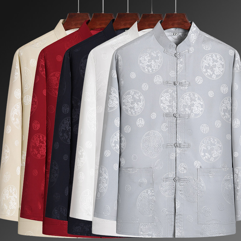 桑蚕丝唐装男长袖上衣中老年春夏薄款爸爸中国风真丝绸缎爷爷衣服