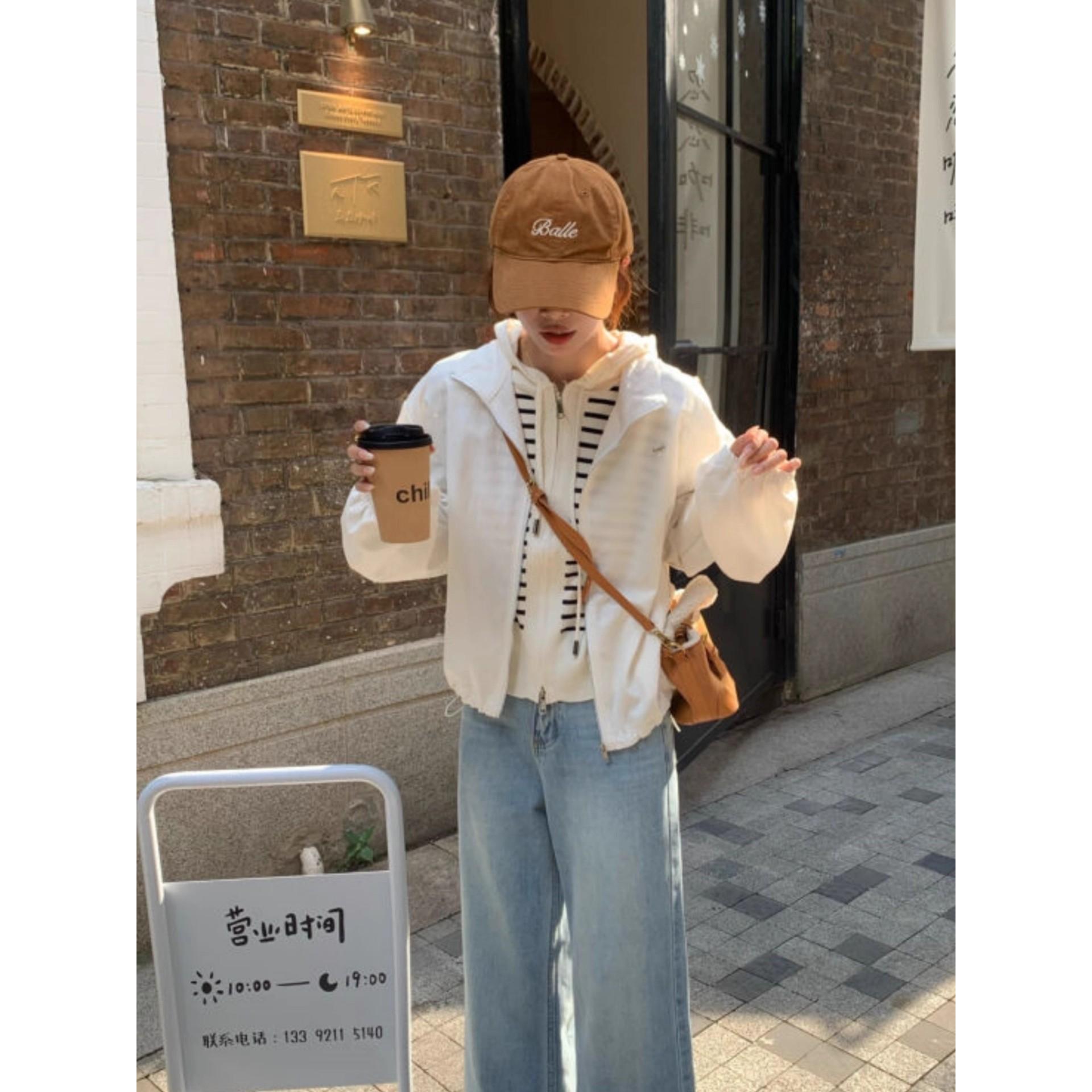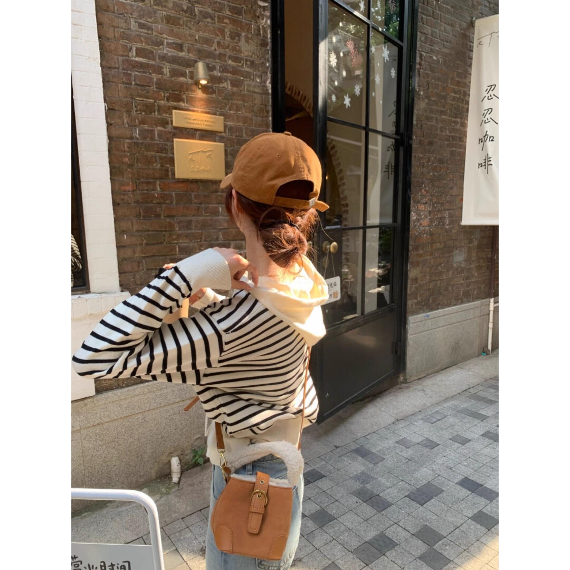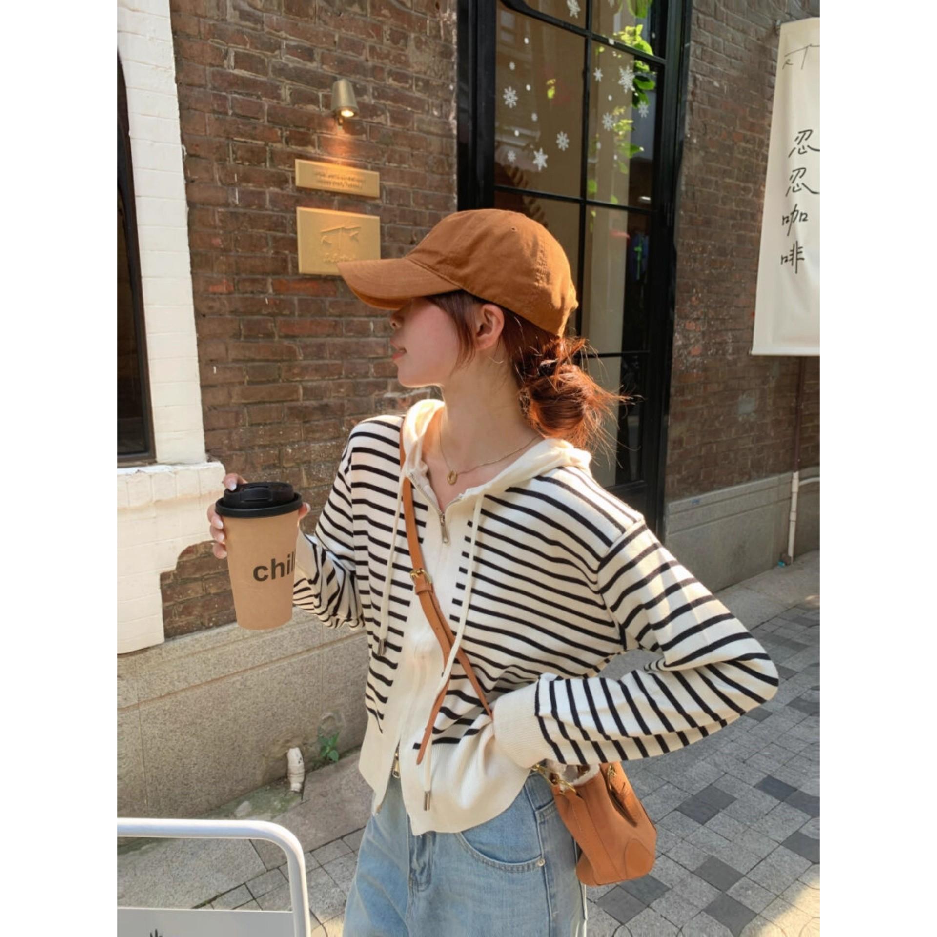 韩系穿搭条纹连帽针织开衫
